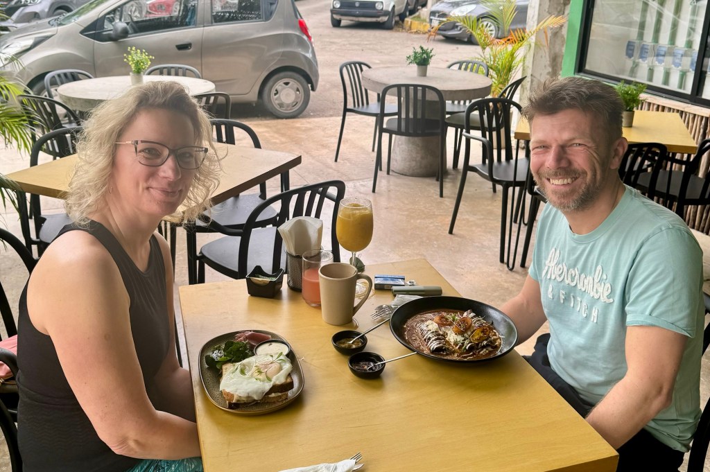Átérve Isla Mujeresről Cancúnba a délben induló komppal volt időnk egy kicsit ebédelni. Nem vágytunk nagy kajára, ketten ettünk egy kis diétás csirkemellet rizzsel és salátával. Majd taxival kimentünk a reptérre és szuper nyugiban végigmentünk a kötelező körökön. Este hatkor indult volna a gép, de bő egy órával később szálltunk fel. Ez azért vált innentől izgalmassá, mert Frankfurtban eredetileg szűk két óránk volt átszállni, így viszont a menetidő szerint már csak 45 perc maradt. A frankfurti reptér meg baromi nagy, ezt tudom 15 éves korom óta.