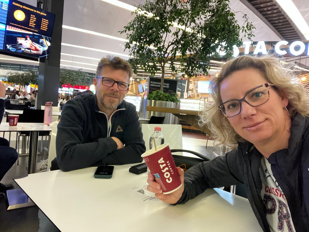 Este 9-kor már fellőtték a pizsamát mindenkinek a repülőn. Csendben, bekuckózva majd mindenki aludt. Én szűk 6 órát, Bandi bő 6 órát aludtunk kisebb forgolódós, kényelmes pozíciót kereső megszakításokkal. Frankfurtba végül másnap (29-én) egy bő félórás késéssel érkeztünk. Így maradt szűk másfél óránk az átszállásra. Ezt belső, reptéri transzfer nélkül nem tudtam volna megfutni az tuti. Olyan nagy a reptér, hogy így is 3 különböző kocsival, egy vonattal és egyszer meg kerekesszékkel vittek. De profin nyomták mindannyian, elértük a budapesti gépet, bár mi szálltunk fel utolsóként.