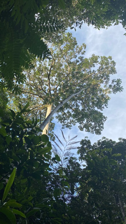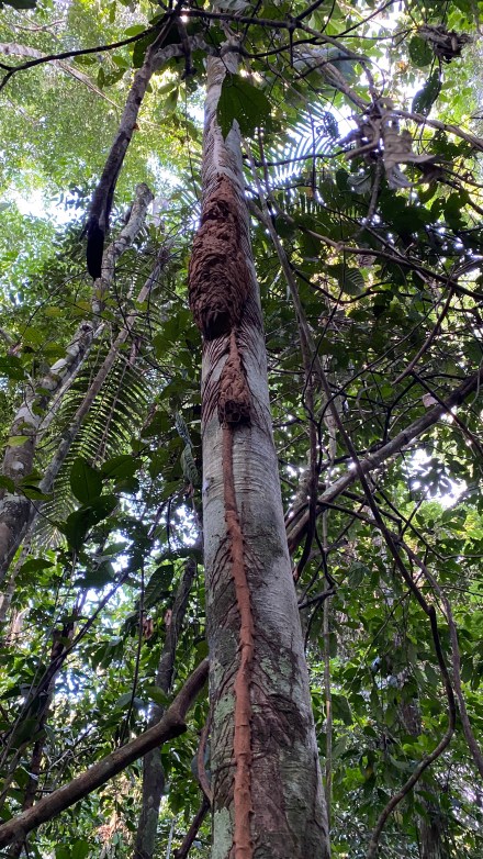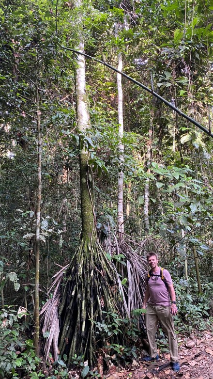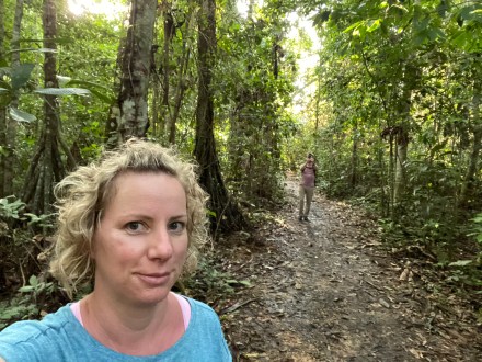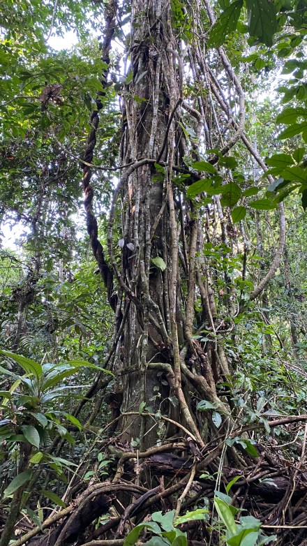 Délután szimplán csak izzadtunk mert olyan meleg van, és olyan magas a páratartalom. Aztán 4 óra előtt elindultunk a mai túravezetőnkkel. Ő kevésbé beszédes, mint az előző túravezetőink. Azon az úton indultunk, amin tegnap este mentünk éjszakai túrára. Gondoltam magamban, nagyon izgalmas lesz, ha mégegyszer ugyanazt megnézzük, csak éppen világosban… De hamar túlmentünk az éjszakai túrás szakaszon, majd jött az igazán dzsungel. Vad buja növényzet, átlagosan 30-40 méter magas fák indákkal és mindenféle más zöld növénnyel befutva. Kapkodtuk a szemünk, na meg a lábunk is. És már épp megjegyeztem Bandinak, hogy hova sietünk ennyire, amikor megpillantottuk a világ második legnagyobb fáját (a legnagyobb Amerikában, a Sequoia Nemzeti Parkban lévő mammut fenyő), és csak álltunk és bámultunk. Esélytelen visszaadni képen. A 300-400 éves fát körbejárva csodáltuk. Megtudtuk, hogy ez a fa kb kétszer olyan magas, mint itt az átlagos 30 méteres fák. A közelében volt egy másik óriás fa, aminek bár a törzse jóval karcsúbb volt, ámde a korát 800-1000 évre becsülik. A fa mindenkit az Avatar filmre emlékeztetett, mert 40 méteres magasságba a keresztágakon különféle növények telepedtek meg és zöldelltek rajta. Fantasztikus volt.