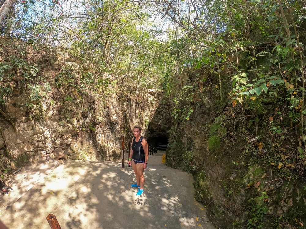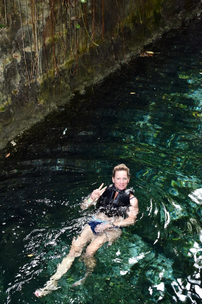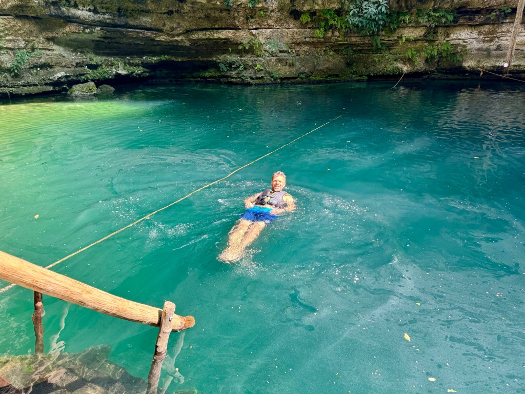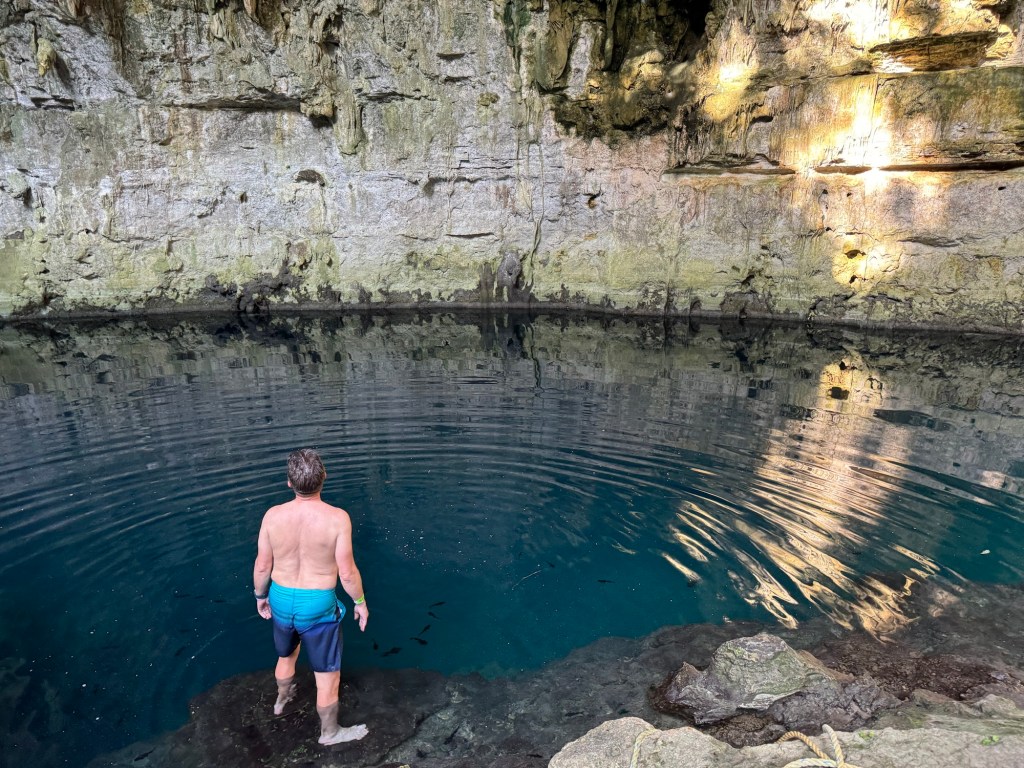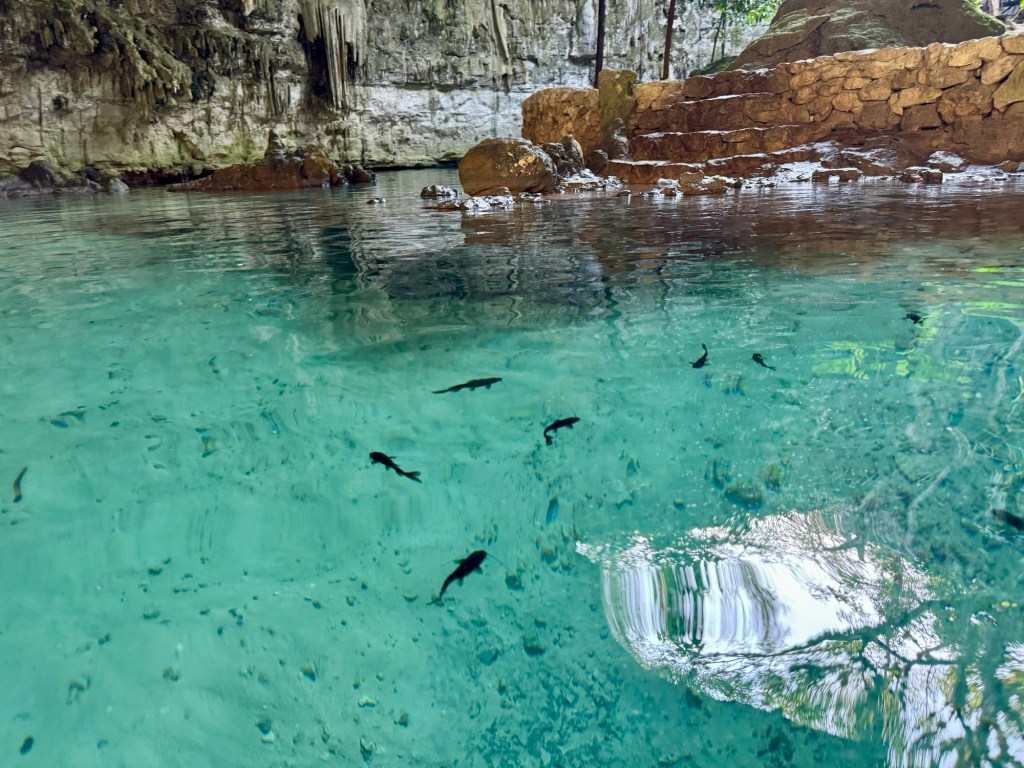 Ma már reggel meleg volt, de napközben 34 fokot is mutatott a hőmérő, amit néha többnek éreztünk. Így aztán a mai nap arra gondoltunk, hogy a romváros megnézését felfrissítjük egy cenoteban való mártózással. A cenote vize édes víz, állatvilággal teli, és kellőképp hideg.