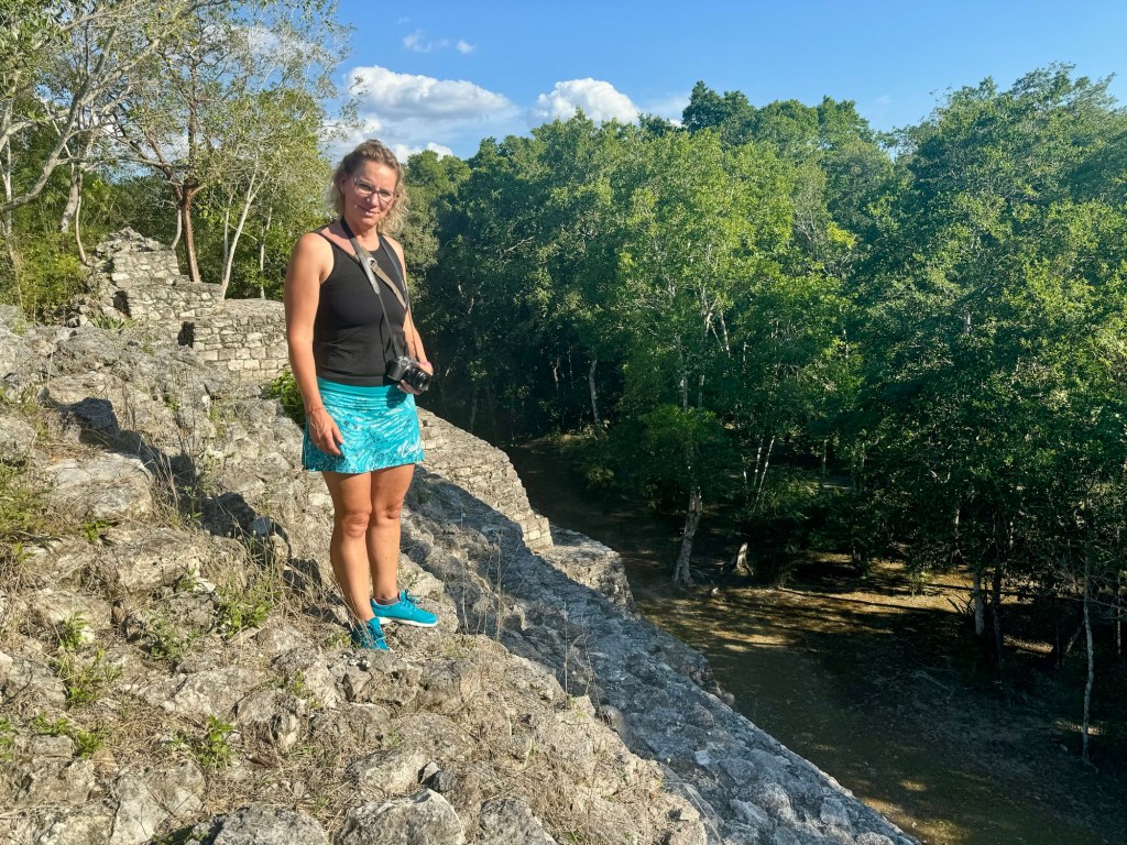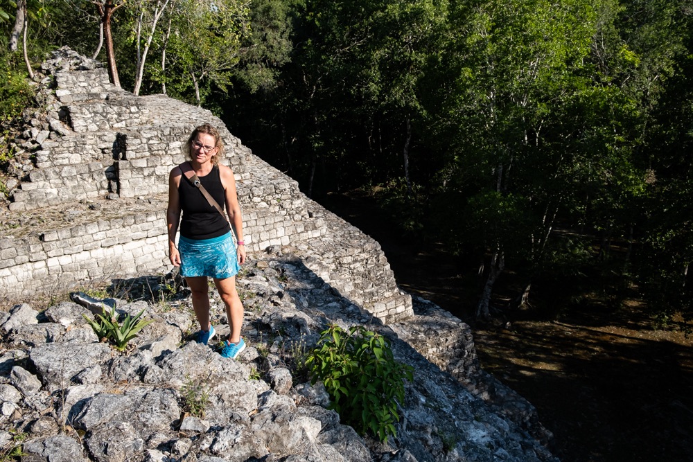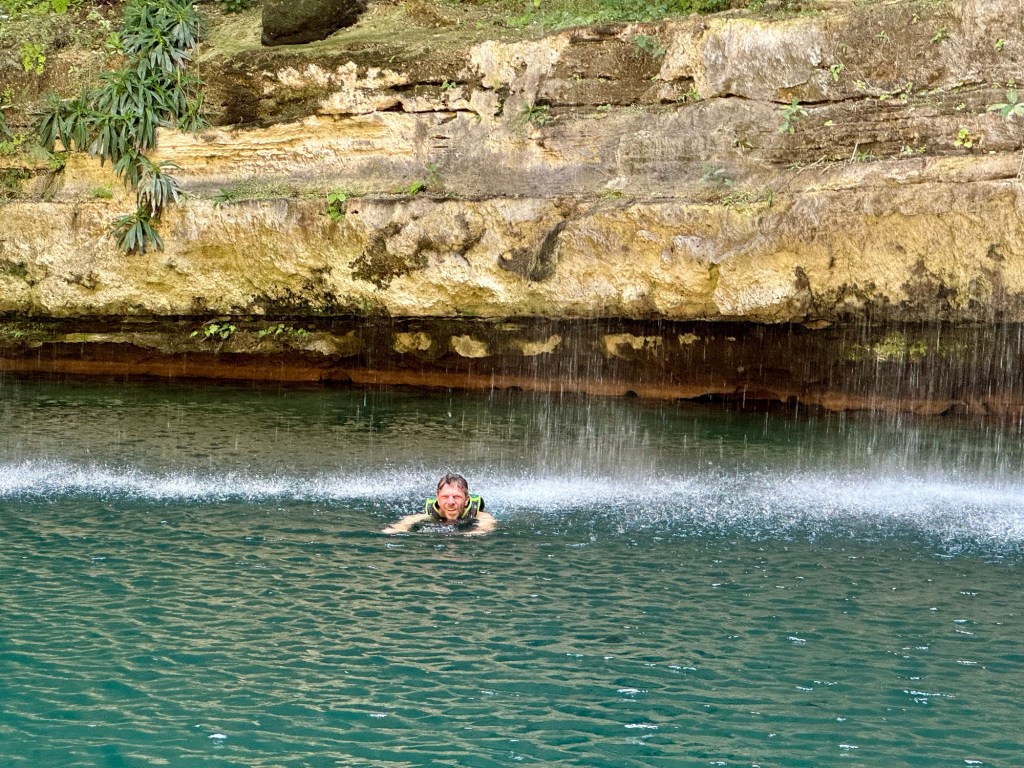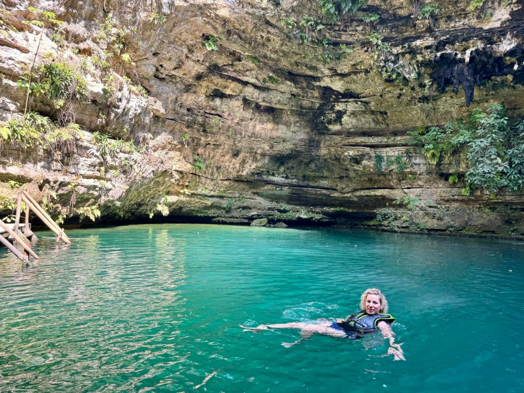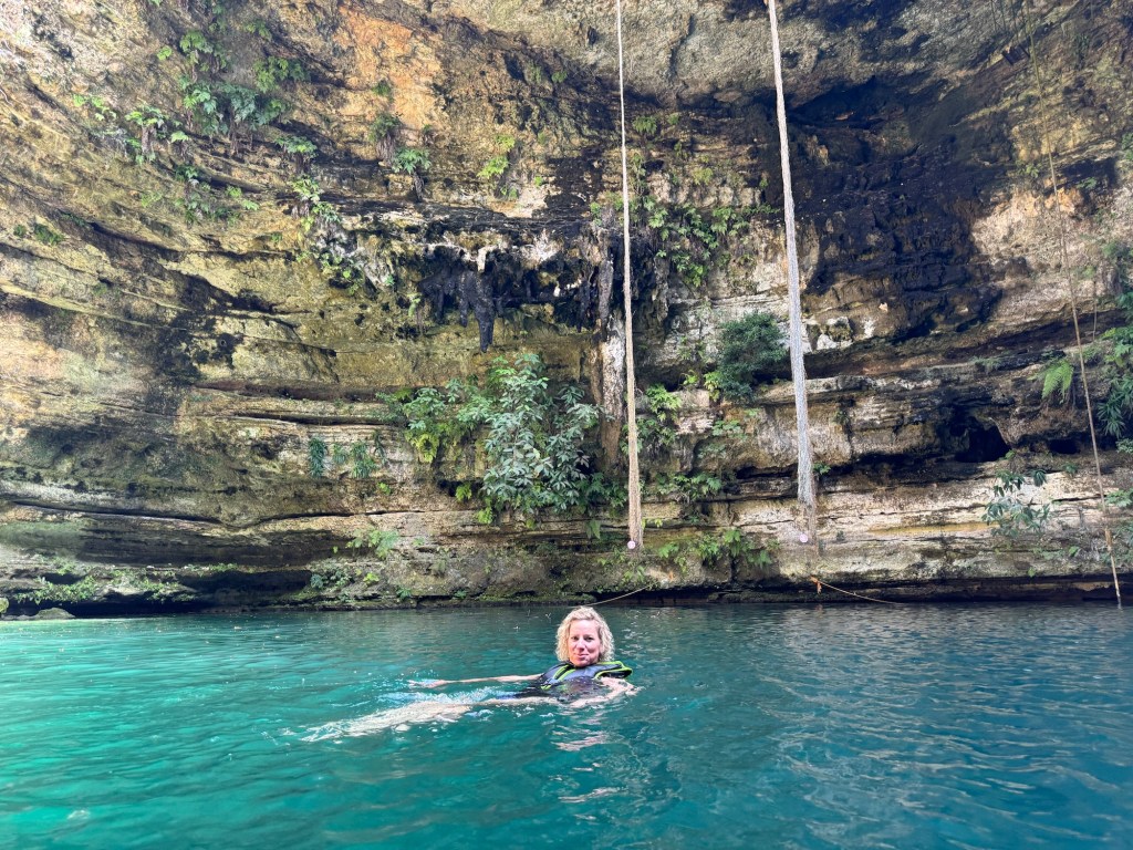 Ma már reggel meleg volt, de napközben 34 fokot is mutatott a hőmérő, amit néha többnek éreztünk. Így aztán a mai nap arra gondoltunk, hogy a romváros megnézését felfrissítjük egy cenoteban való mártózással. A cenote vize édes víz, állatvilággal teli, és kellőképp hideg.
