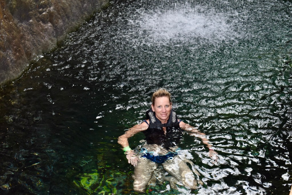 A negyedik állomás pedig egy “Ojo de agua” avagy a “víz szeme” nevű hely volt, ahol egy víz alatti forrásból bugyogott fel a friss édesvíz. Hihetetlenül tiszta volt a víz, a környező fákon különleges madarak, és közben a vízparton egy elég méretes krokodil mozdulatlanul várta az uzsonnáját. Ez mind úgy, hogy kint volt egy tábla, hogy be szabad menni a vízbe! Teszem hozzá Bandin fürdőnadrág volt…