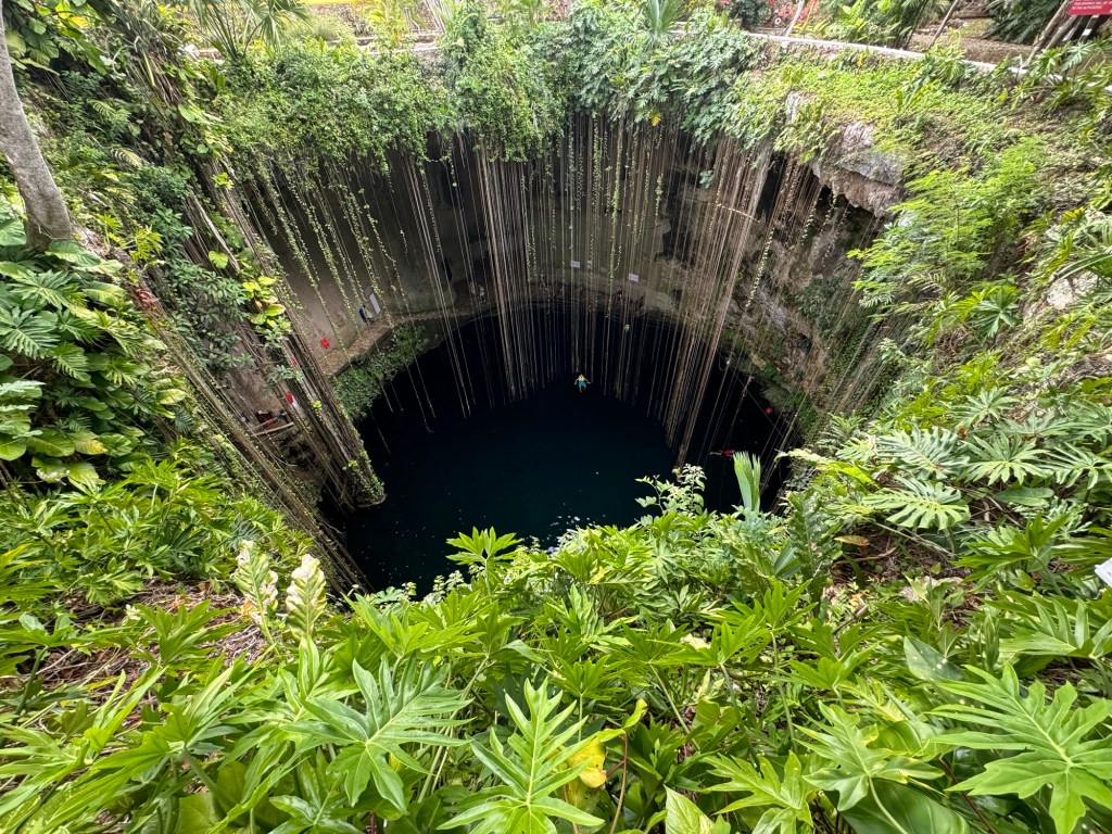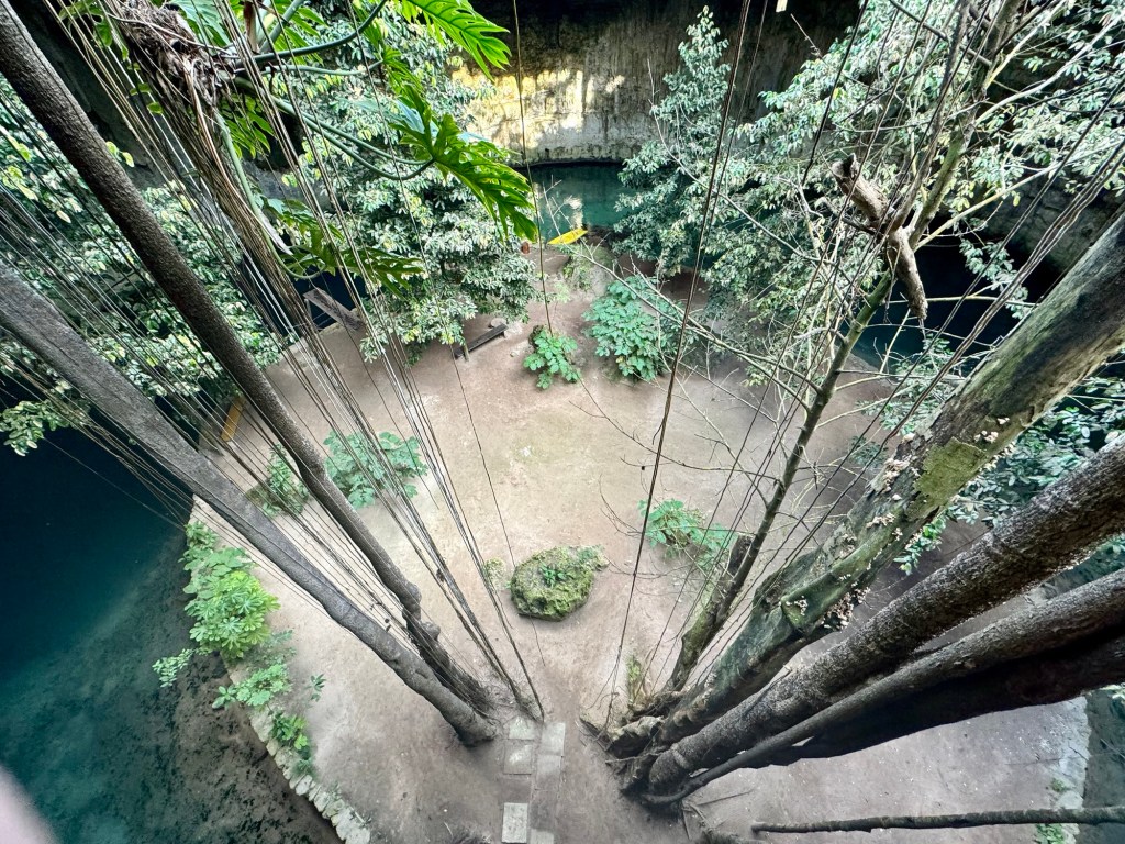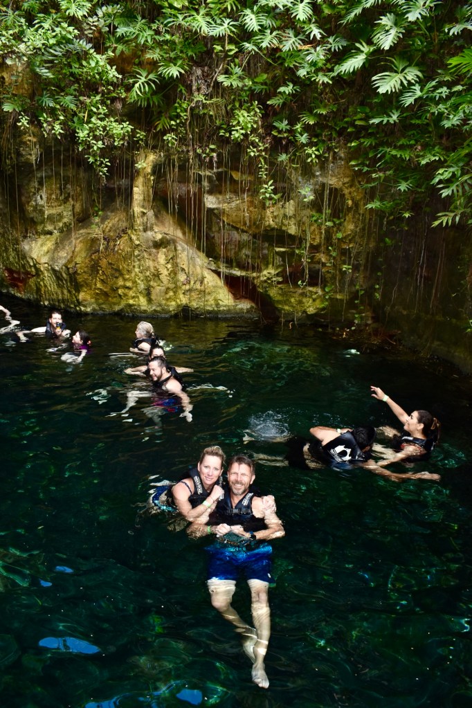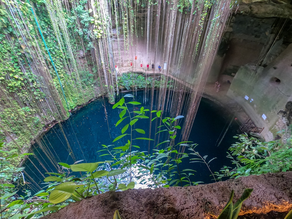 Chichén Itzától 5 percre van egy nagyon szépen kiépített ilyen vízgyűjtő fürdőző hely, a Cenote Ik Kil. Mivel közel van egy neves turista látványossághoz ezért ez az egyik legfelkapottabb ilyen hely. De itt is annyira ideális időpontban érkeztünk, hogy rajtunk kívül egy pár volt, akik mielőtt távoztak még lefotóztak minket. Utána miénk volt a hideg víz.
