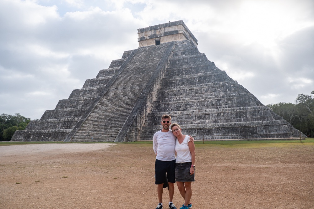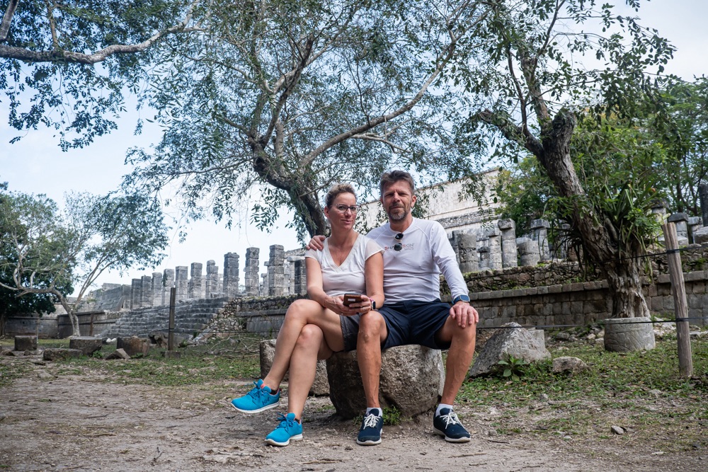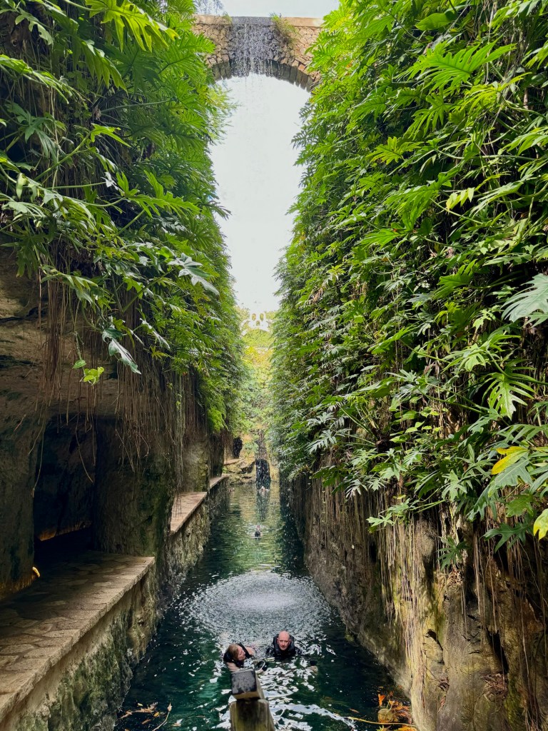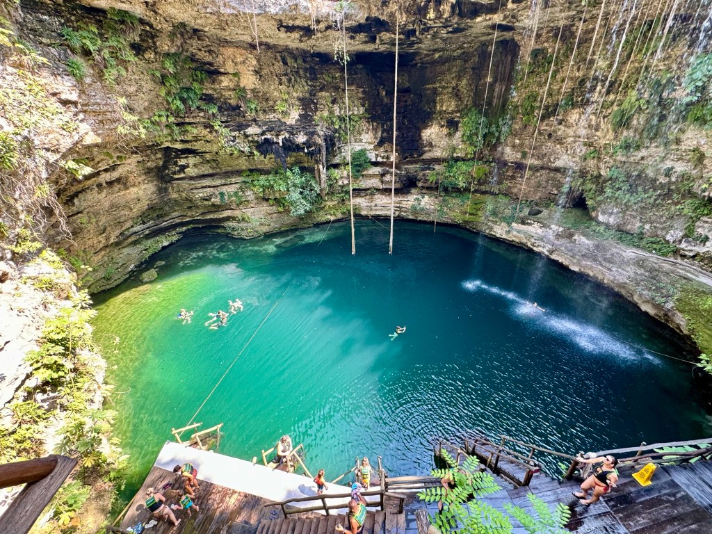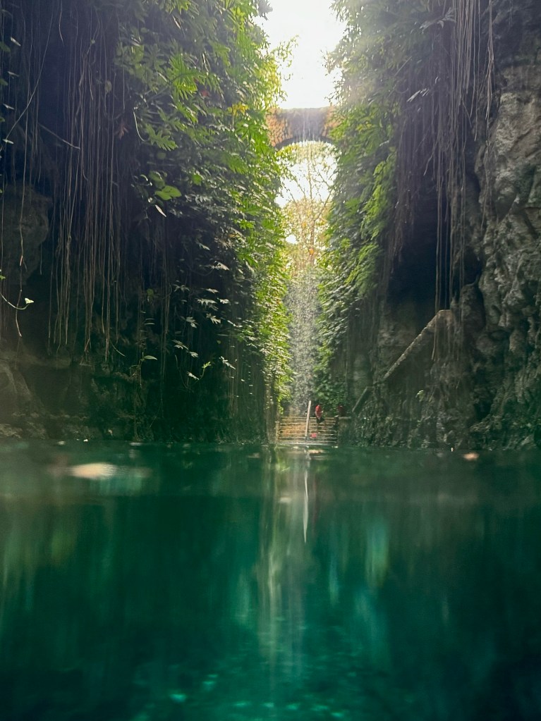 Chichén Itzától 5 percre van egy nagyon szépen kiépített ilyen vízgyűjtő fürdőző hely, a Cenote Ik Kil. Mivel közel van egy neves turista látványossághoz ezért ez az egyik legfelkapottabb ilyen hely. De itt is annyira ideális időpontban érkeztünk, hogy rajtunk kívül egy pár volt, akik mielőtt távoztak még lefotóztak minket. Utána miénk volt a hideg víz.