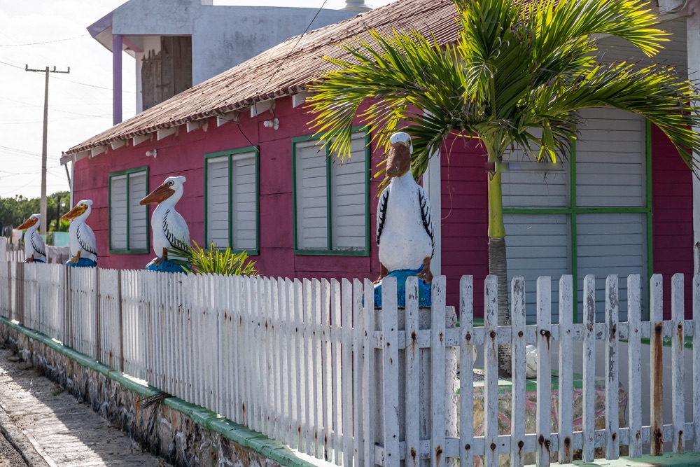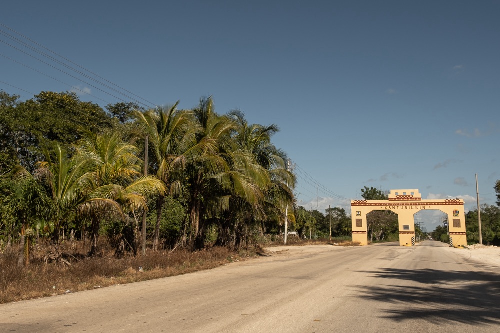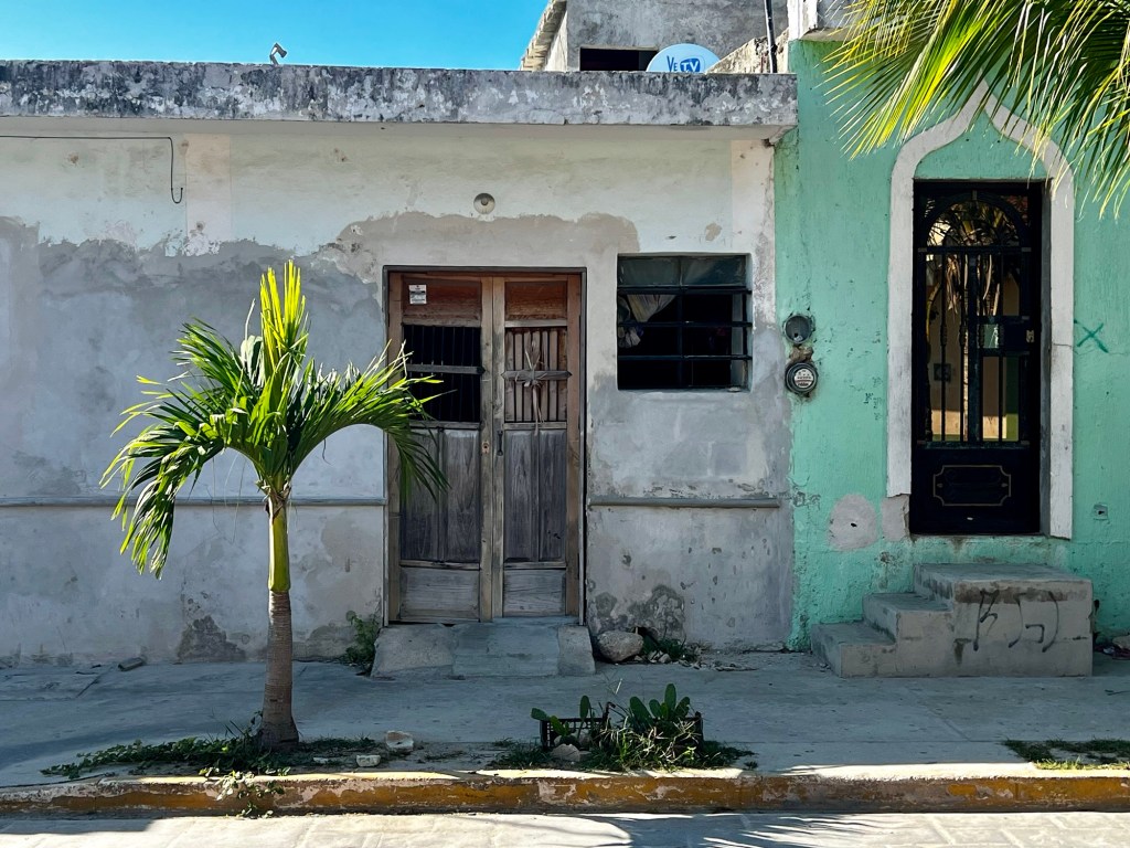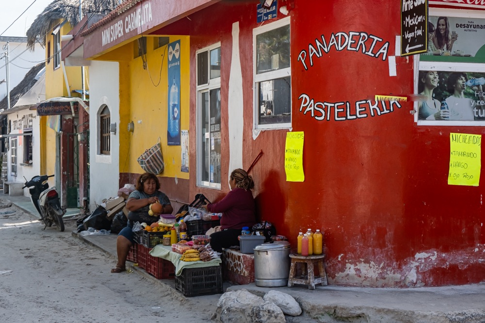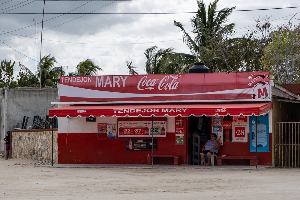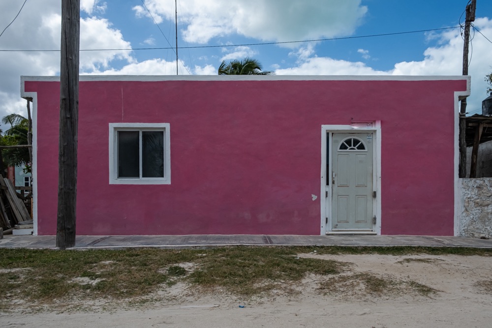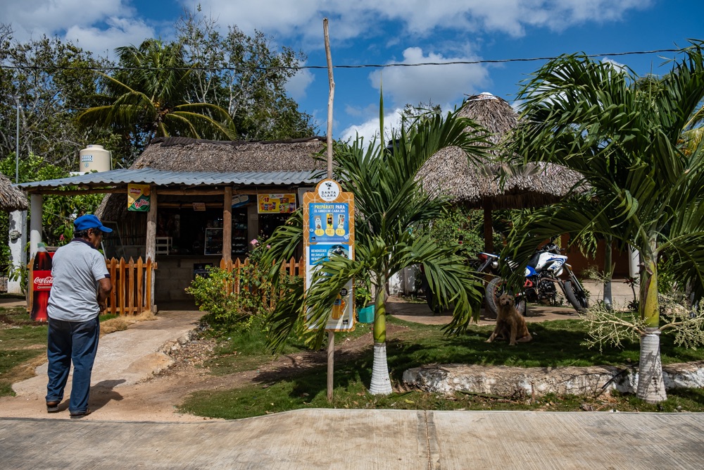Az autópálya szakasz után egy olyan főúton mentünk, ami három kisebb falun megy át. Az első falu: Kantunilkín volt. Itt éreztünk először, hogy na, megérkeztünk Mexikóba! A hely hangulata, a házak fazonja, a kerítésre festett képek, a rottyant biciklit toló asszony és a falu közepén egymás mellett álló élénk színűre festett művelődési ház meg a templom. De a mexikó érzést az út szélén ránk váró rendőr is segítette: szerinte nem mentünk elég lassan, szóval 500 peso (10 e Ft) lesz. Amikor kikerekedett szemekkel visszakérdeztem, akkor ő csak annyit kérdezett: Cancúnból jössz és Holboxba mész? Bérelt autóval? Akkor bizony 500. Bandi mikor odaadta neki a pénzt, akkor úgy gyűrte be a tenyerébe, mintha nem is kapott volna semmit.