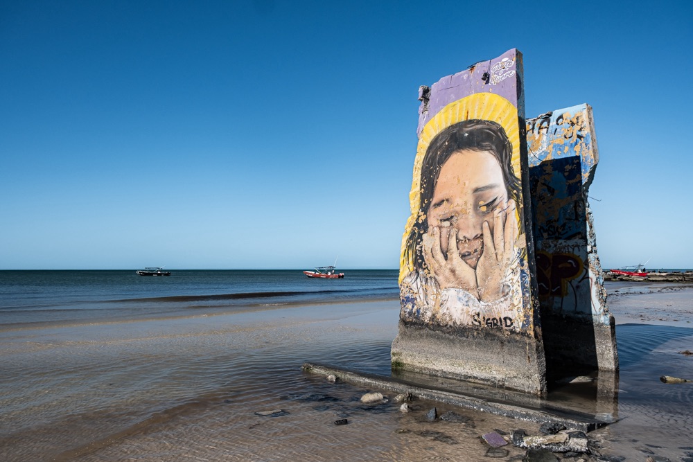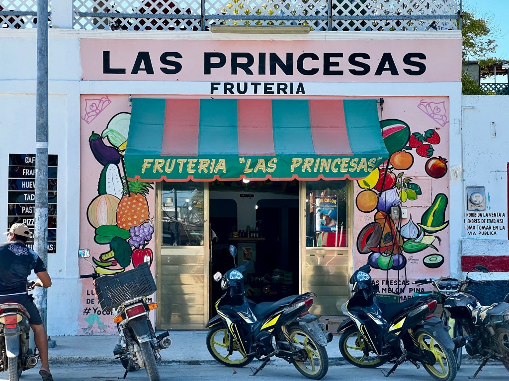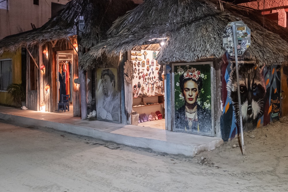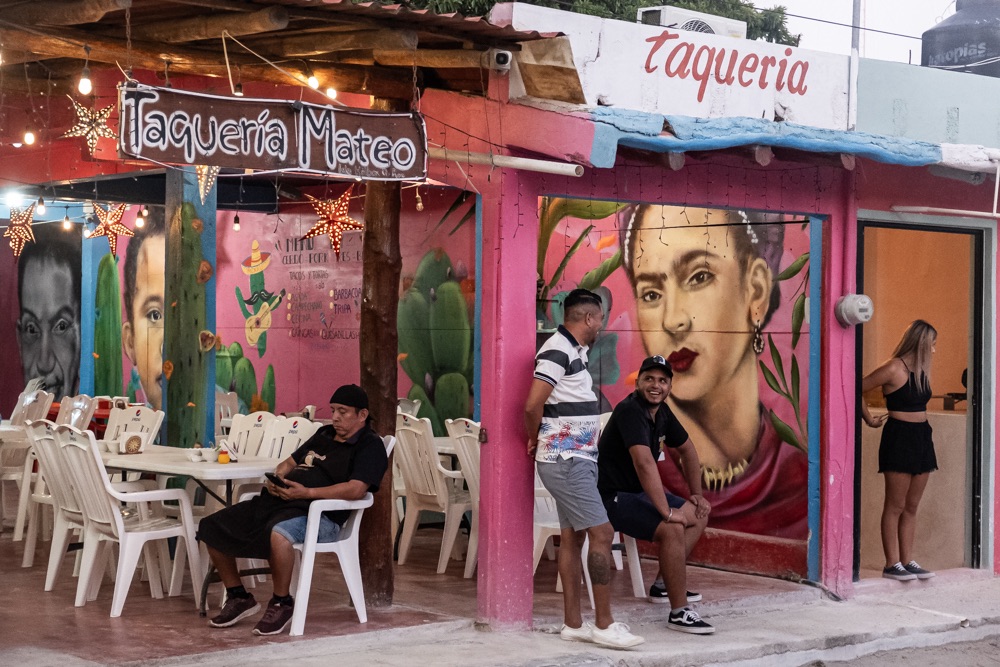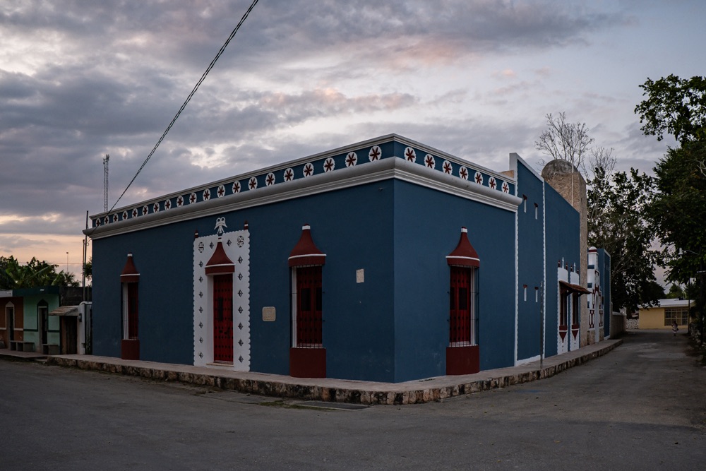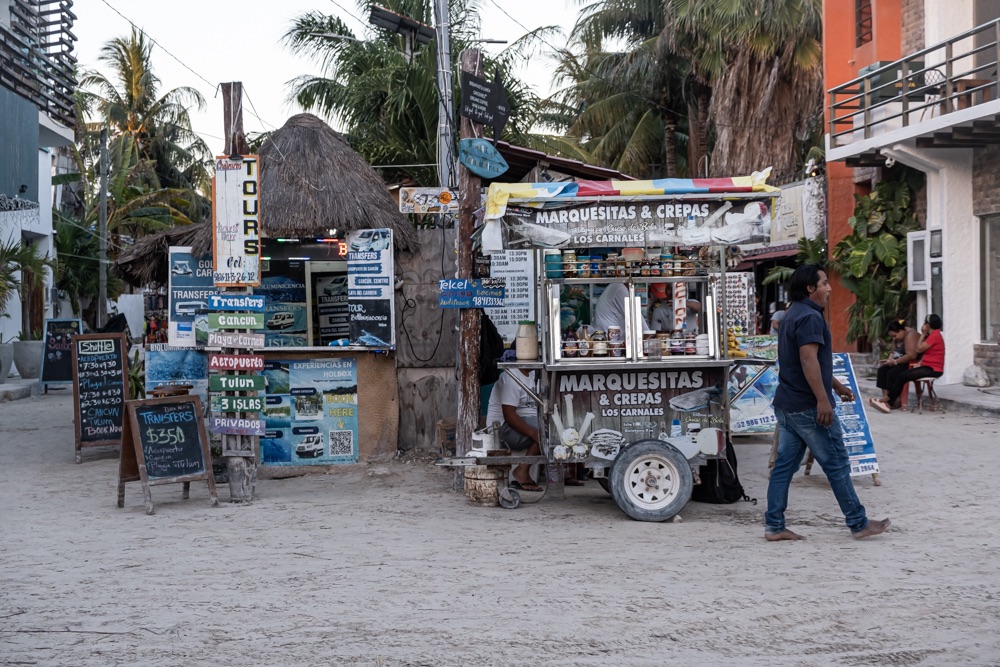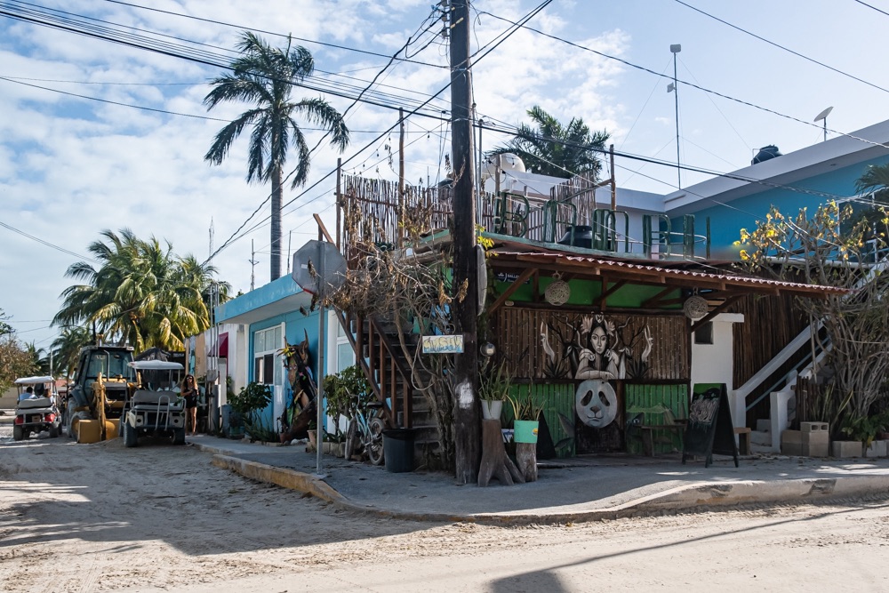 Az autópálya szakasz után egy olyan főúton mentünk, ami három kisebb falun megy át. Az első falu: Kantunilkín volt. Itt éreztünk először, hogy na, megérkeztünk Mexikóba! A hely hangulata, a házak fazonja, a kerítésre festett képek, a rottyant biciklit toló asszony és a falu közepén egymás mellett álló élénk színűre festett művelődési ház meg a templom. De a mexikó érzést az út szélén ránk váró rendőr is segítette: szerinte nem mentünk elég lassan, szóval 500 peso (10 e Ft) lesz. Amikor kikerekedett szemekkel visszakérdeztem, akkor ő csak annyit kérdezett: Cancúnból jössz és Holboxba mész? Bérelt autóval? Akkor bizony 500. Bandi mikor odaadta neki a pénzt, akkor úgy gyűrte be a tenyerébe, mintha nem is kapott volna semmit.