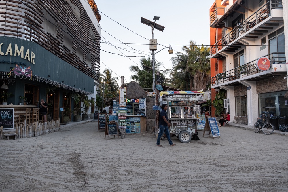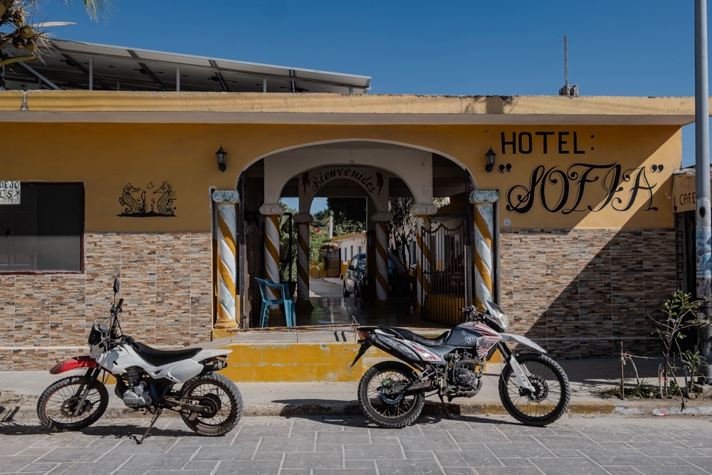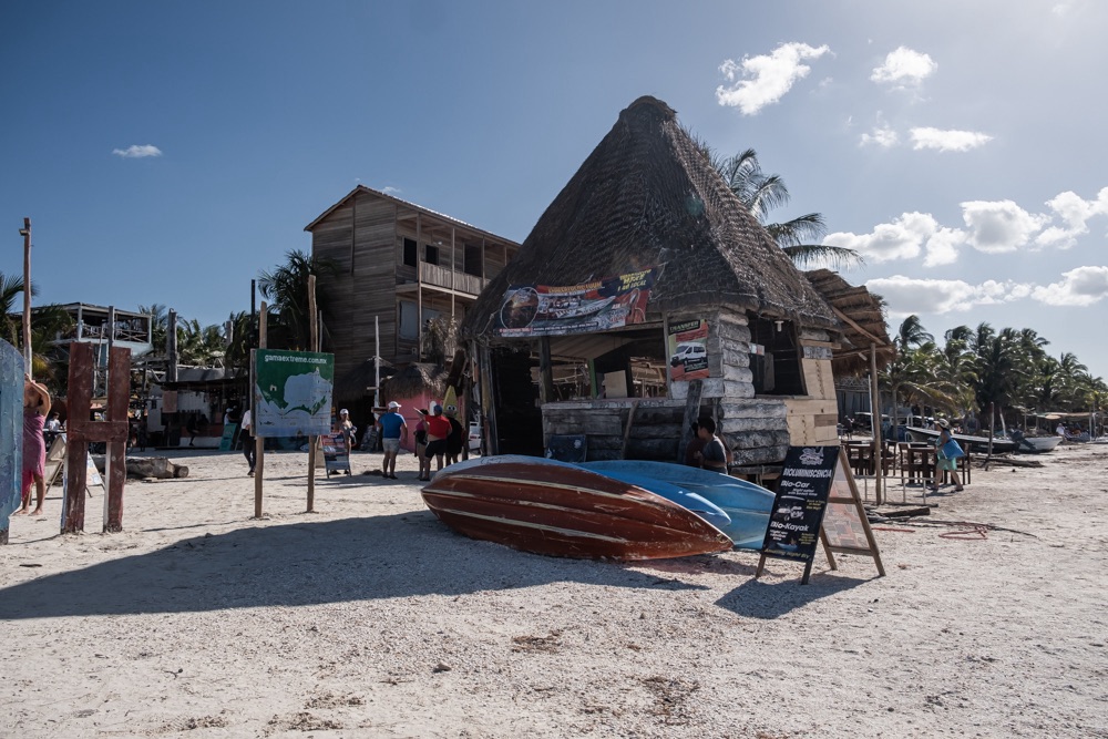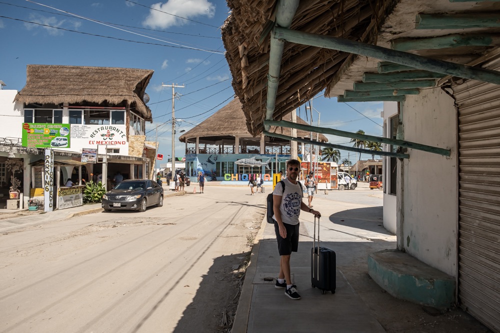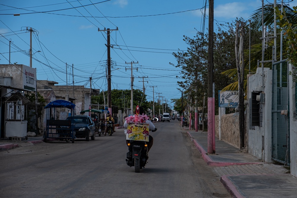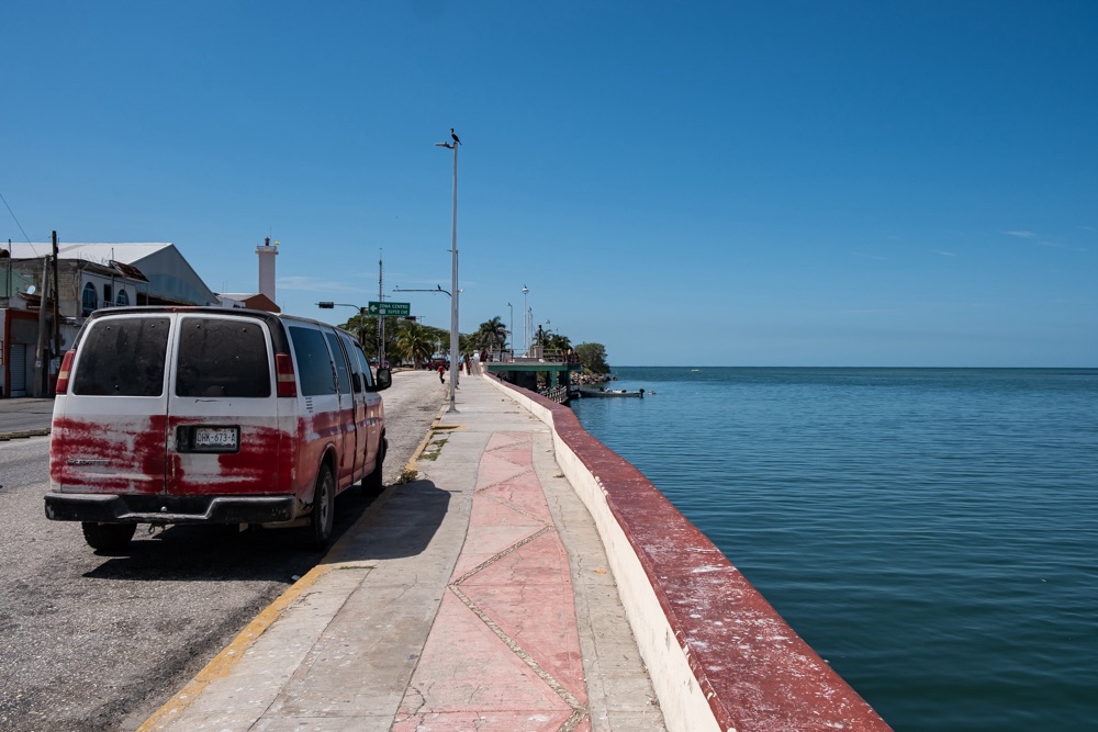 Ahogy közeledtünk a komphoz úgy volt az út minősége egyre gyengébb és az úton lévő kátyúk egyre mélyebbek. Chiquila olyan formában él a turizmusból, hogy nagyjából mindenkinek a kertje egy parkoló, amit kiad a Holboxba menő turistáknak ugyanis a komp csak személyszállító.