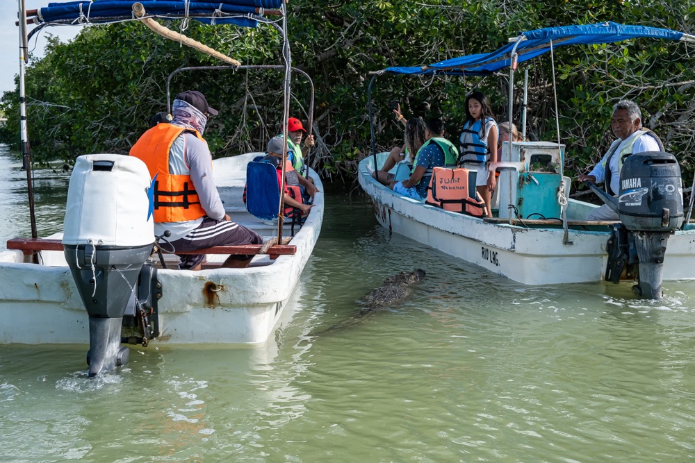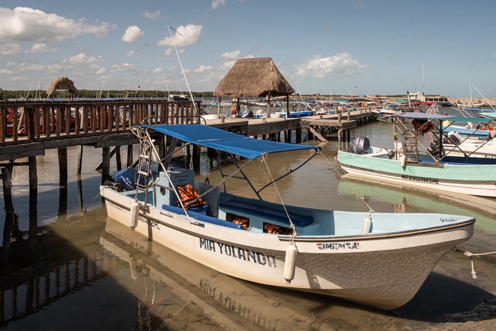 A település előtt van egy híd amely mellett sok-sok motorcsónak várja a turistákat. Bevallom őszintén, hogy jóval szimpatikusabb hely a turisták kezelését illetően, mint Río Lagartos, ahol néhány napja voltunk. Rendezett parkoló, ahol nem kell fizetni, a helyiek nem ugranak rád, hogy meggyőzzenek, hogy vele kell menned, hanem van egy ticket office, ahol befizeted magad egy másfél órás túrára és elvisznek 4 különböző helyre. Lehet választani, hogy társulsz-e másokkal a 6-8 fős csónakban, akkor olcsóbb lesz, vagy kéred, hogy magatokban a csónak kapitánnyal menjetek. Mi ez utóbbi mellett döntöttünk. Valamennyire mindenki beszél angolul, aki a turizmusban dolgozik, de itt már jól lehet gyakorolni a spanyolt.