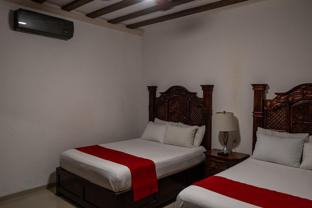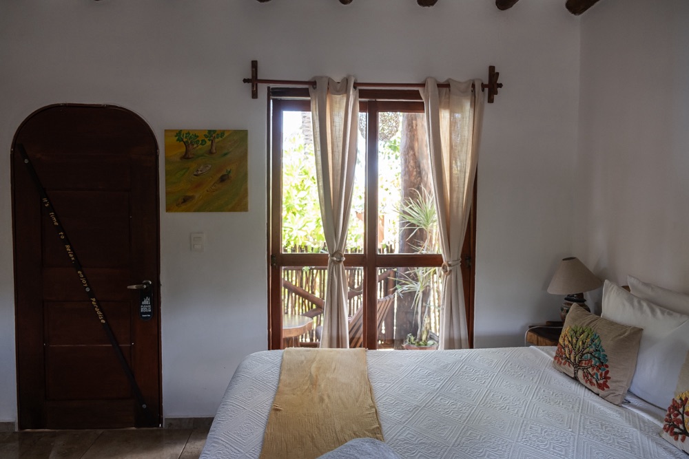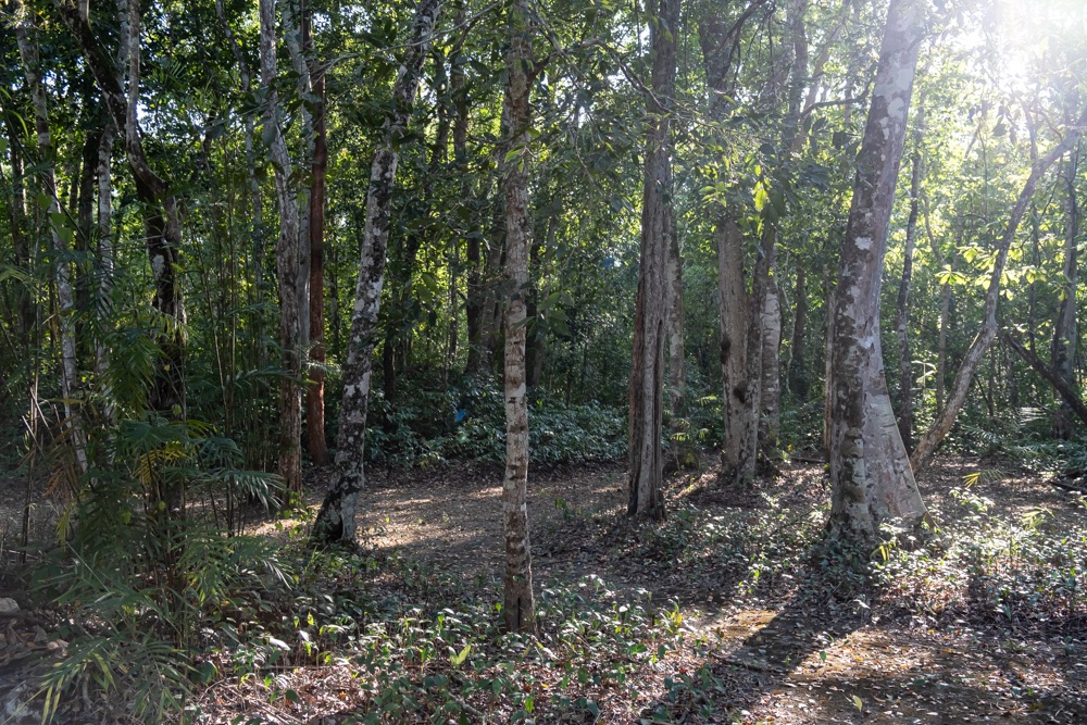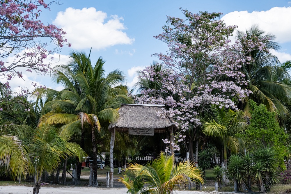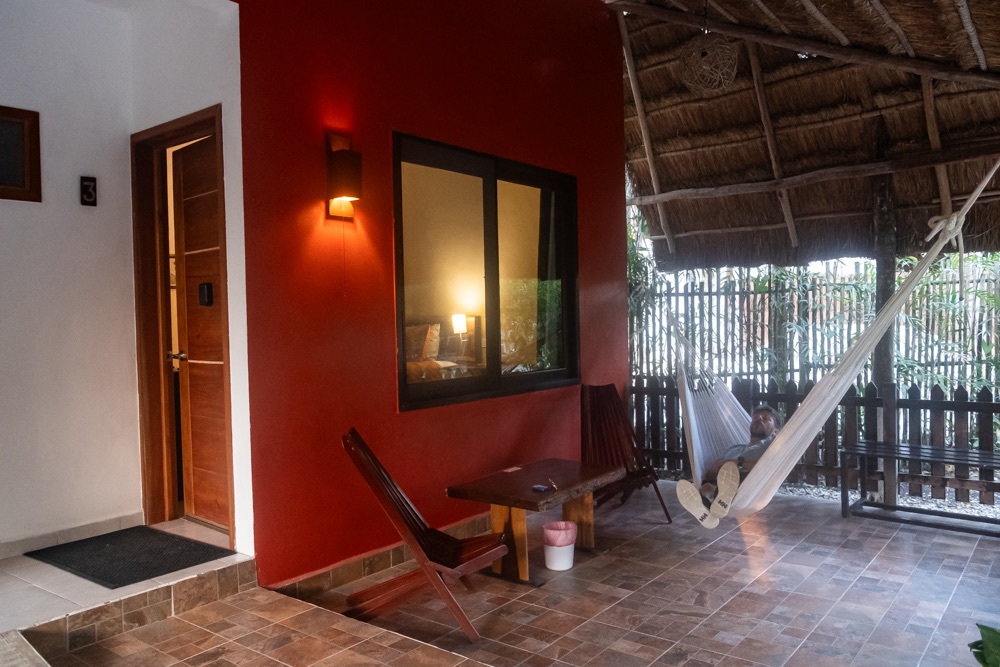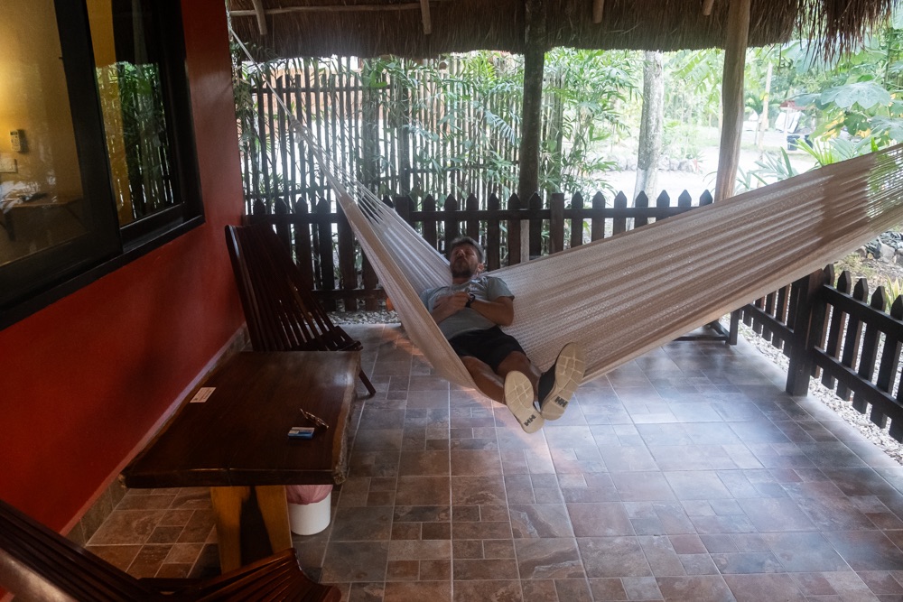A szállásunk Xpujil nevű településen van, ami még egy órányira volt Balamkútól. Mivel fél 5-kor végeztünk Balamkúban és a romvárosok 5 órakor zárnak, így a szállás közelében lévő felfedezni valókat holnapra hagytuk, cserébe megkerestük a szállásunkat. Hát… a településre beérve nem sok jót reméltünk. A közelben egy vasút építése folyik, amelyre rengeteg kamion és teherautó hordja az anyagot, ezekkel van tele a kisváros. Na meg a fehér porral, ami a teherautón lévő építési anyagból hullik. Várhatóan itt is alszanak a sofőrök a kamionjaikban, mert a meló után nem mentek el, hanem a város minden pontján ők parkolnak. Végül az utolsó utcába bekanyarodva egy kis zöld ligetben találtuk magunkat, saját terasszal, függő ággyal.