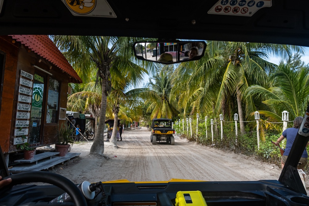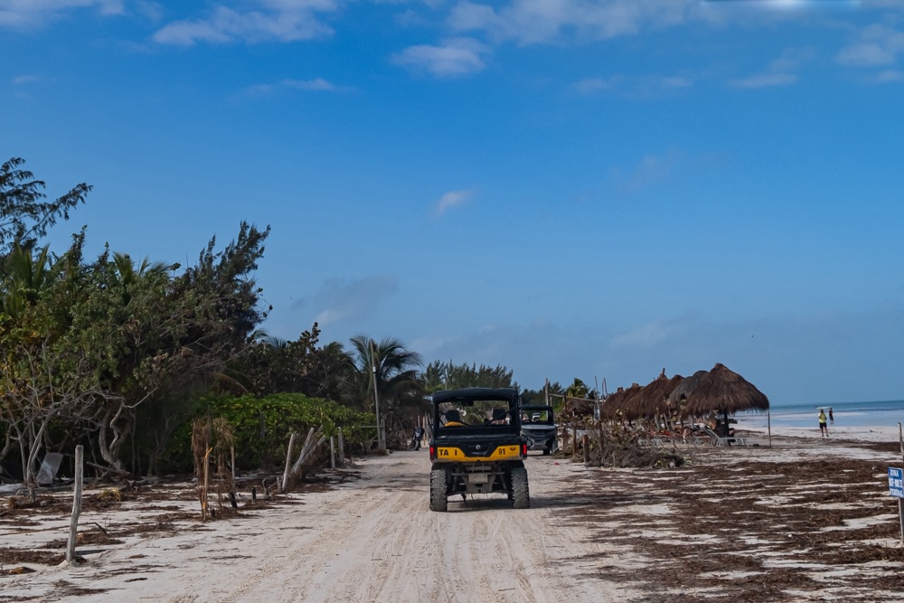 A kikötőben taxik várták az utasokat: nagy kerekű, bármin átmenő Jeep jellegű taxik. Az utcák a végtelenül finom, fehér tengerparti homokkal vannak “leaszfaltozva”. Igen ám, de minden utca állt a vízben. Nem igazán értettük.