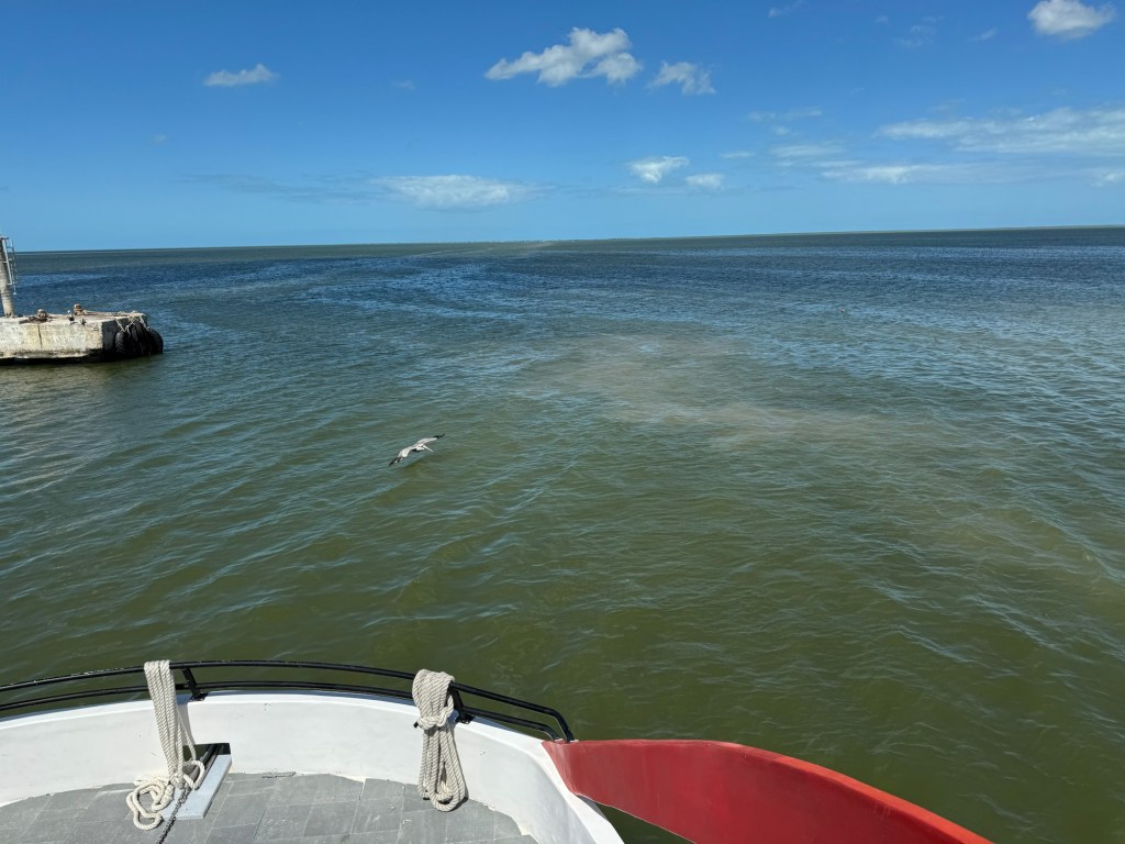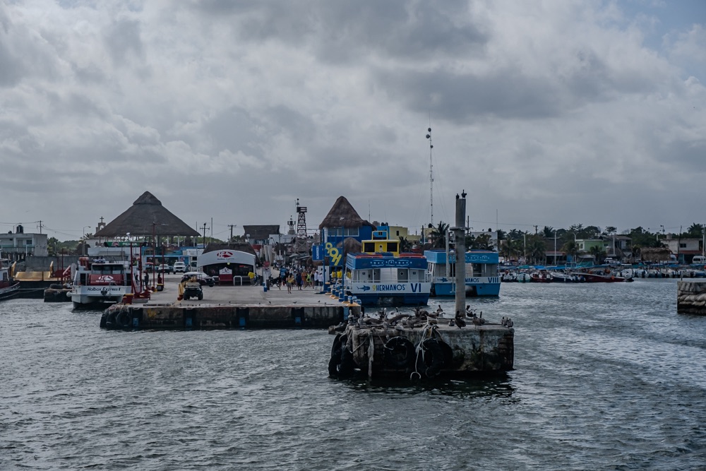 Kora reggel és késő este között minden nap óránként megy a ferry. Ideális időben érkeztünk, mert a parkolás és a jegy vásárlás után éppen csak perceket kellett várnunk, hogy irányt vegyünk a szigetünk felé. Néhány évvel ezelőtt Holbox lakossága a halászatból élt, de az utóbbi években egyre inkább megjelentek a turisták így ma már szerintem ez a fő bevételi forrásuk. Bár Holbox hivatalos honlapján még arról írnak, hogy milyen érintetlen és turista szűz a hely. Hát, sajnos nem. De ebben az is szerepet játszott most, hogy szombat volt és az idei farsangi karnevál is mára esett.