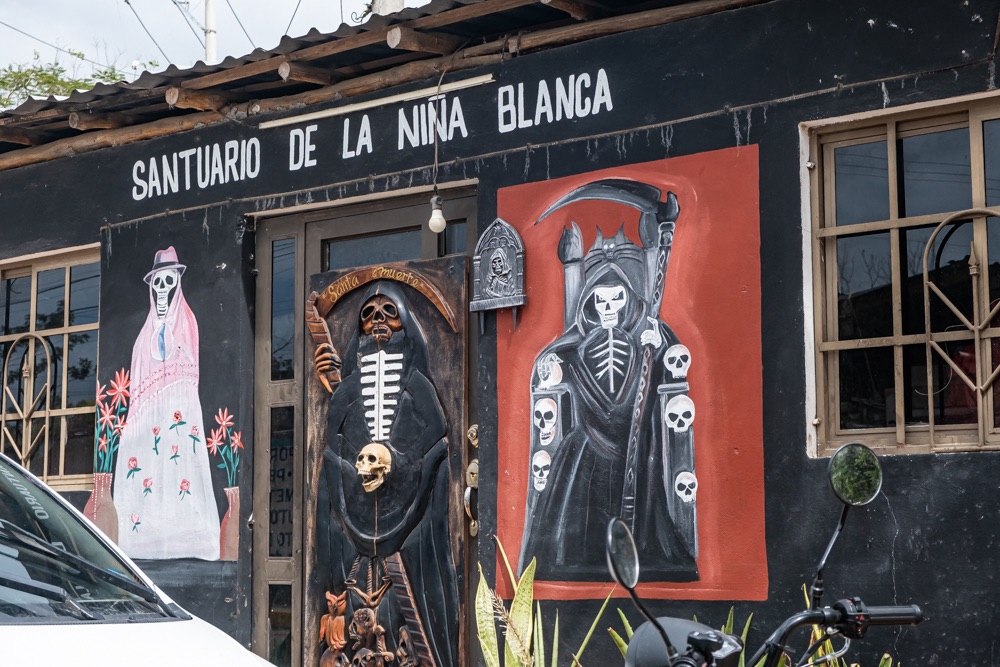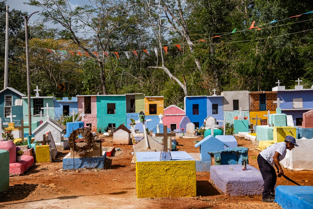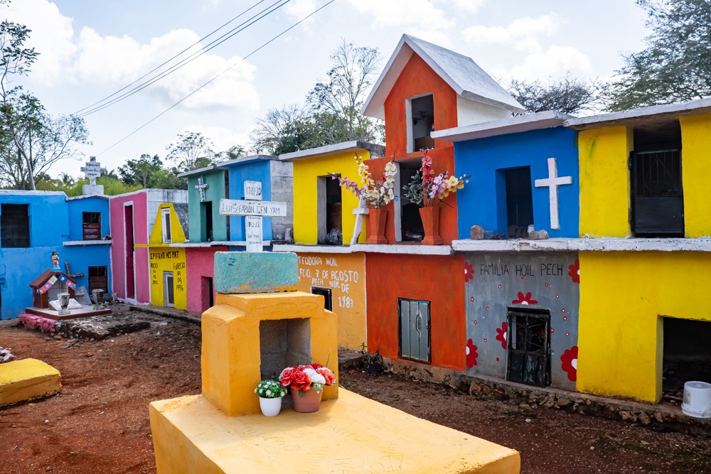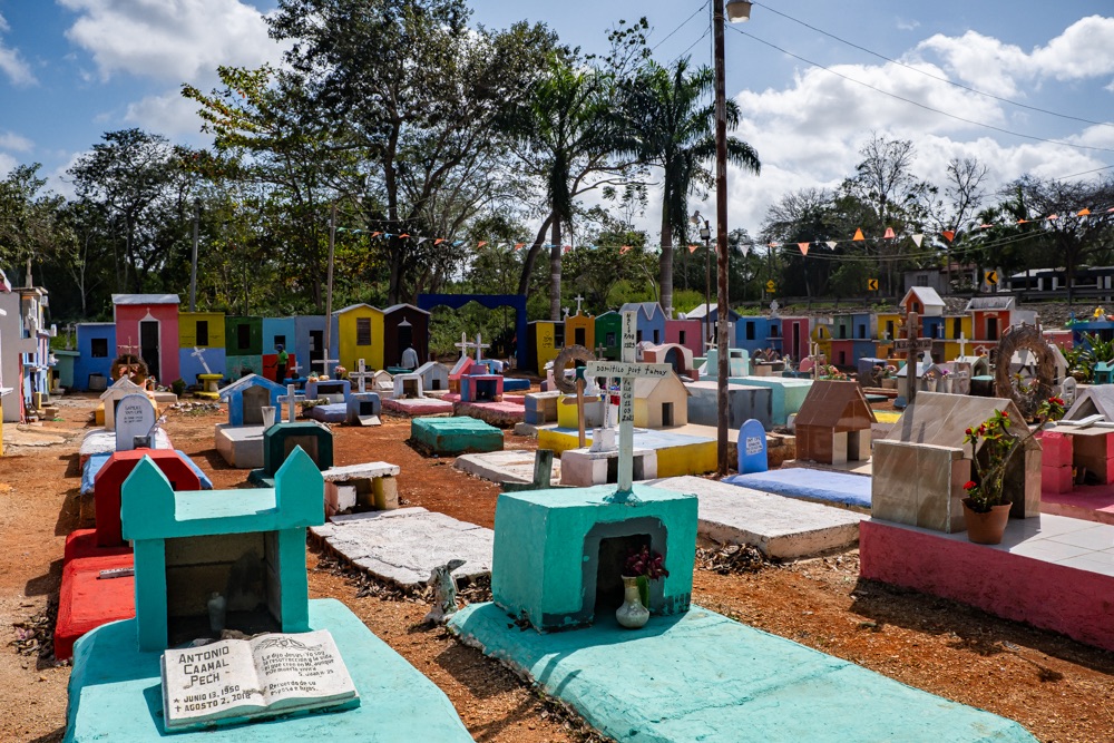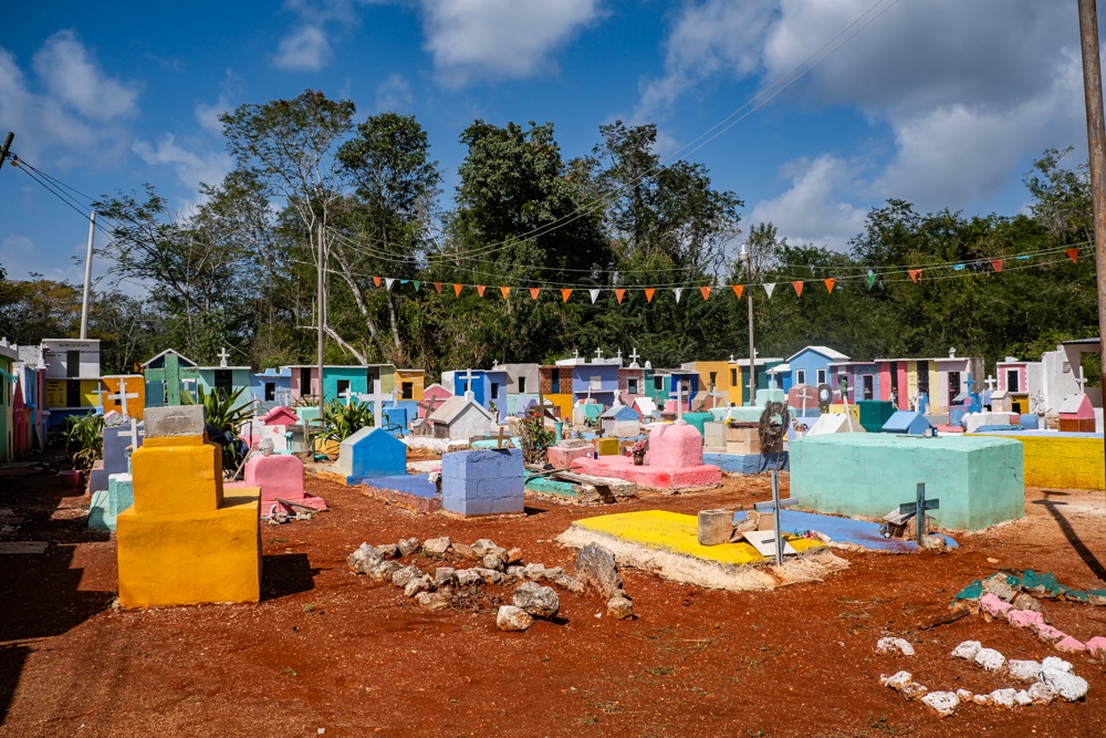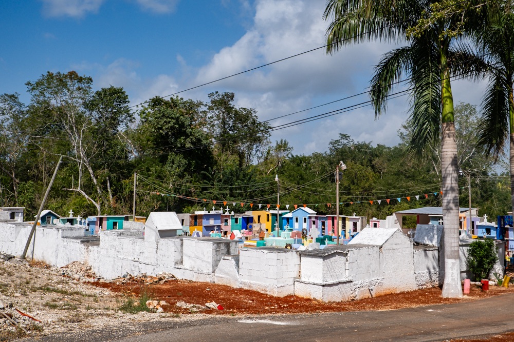 Chichén Itza felé menve láttunk egy kis útszéli, falusi temetőt, ami a mi szemünknek igazán különleges volt: apró nagyon színes “házacskák” az urnáknál, vagy szinten nagyon színes sírhely koporsóval.