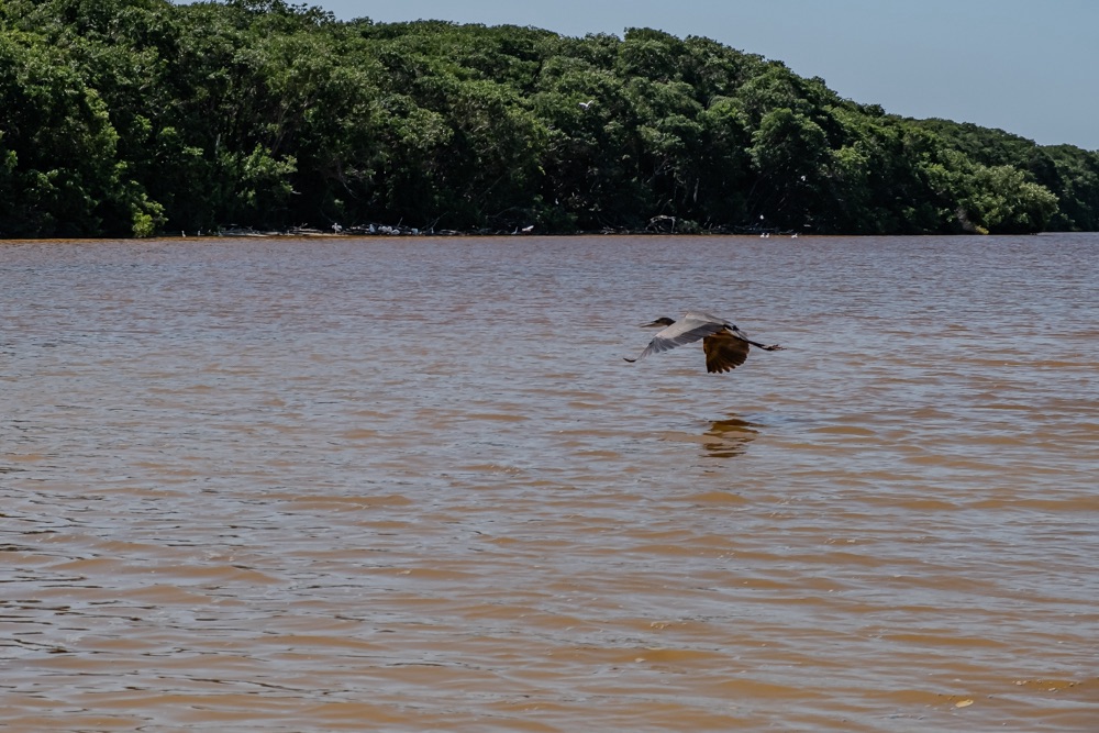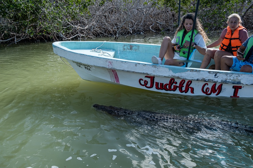 Visszafelé megálltunk Río Lagartos faluban, ahol már a falu elejét jelző fekvőrendőrnél megállítottak minket, ugyanis a biorezervátum csak helyiek segítségével látogatható. Egy rövidebb, egy órás motorcsónakos útra neveztünk be, ahol a rezervátumban a mangrove mentén a pelikánok és flamingók mellett krokodilt is láttunk, bár bevallom, hogy a flamingók olyan távolságban voltak, hogy egy-egy rózsaszín pacaként jelentek meg a szemeink előtt.