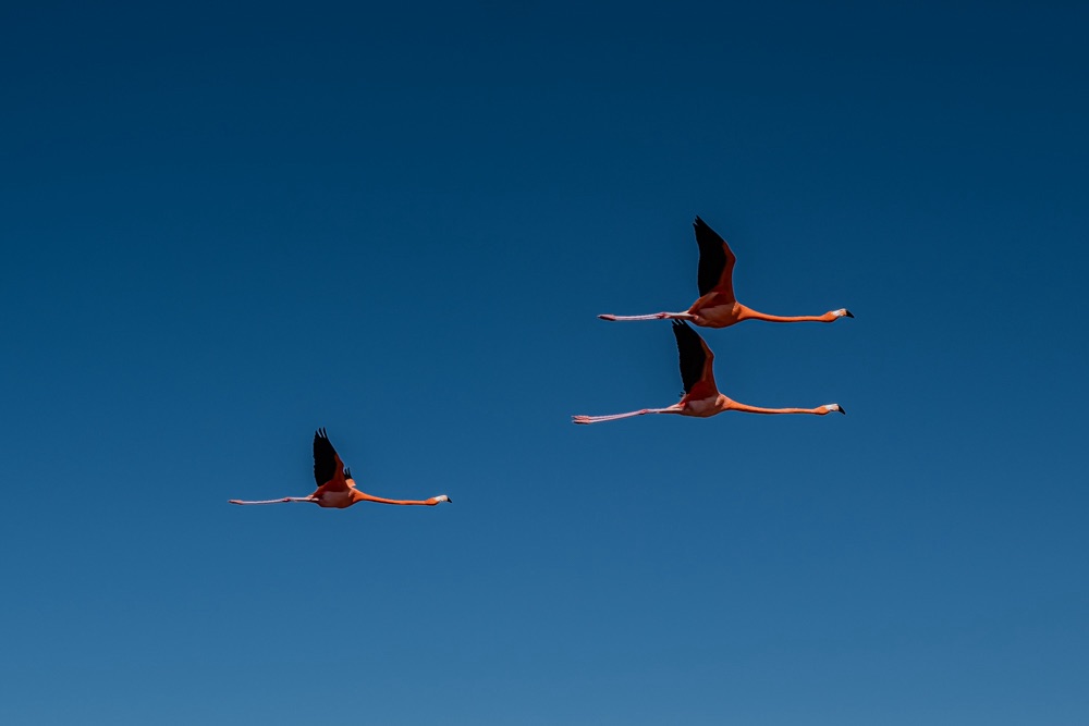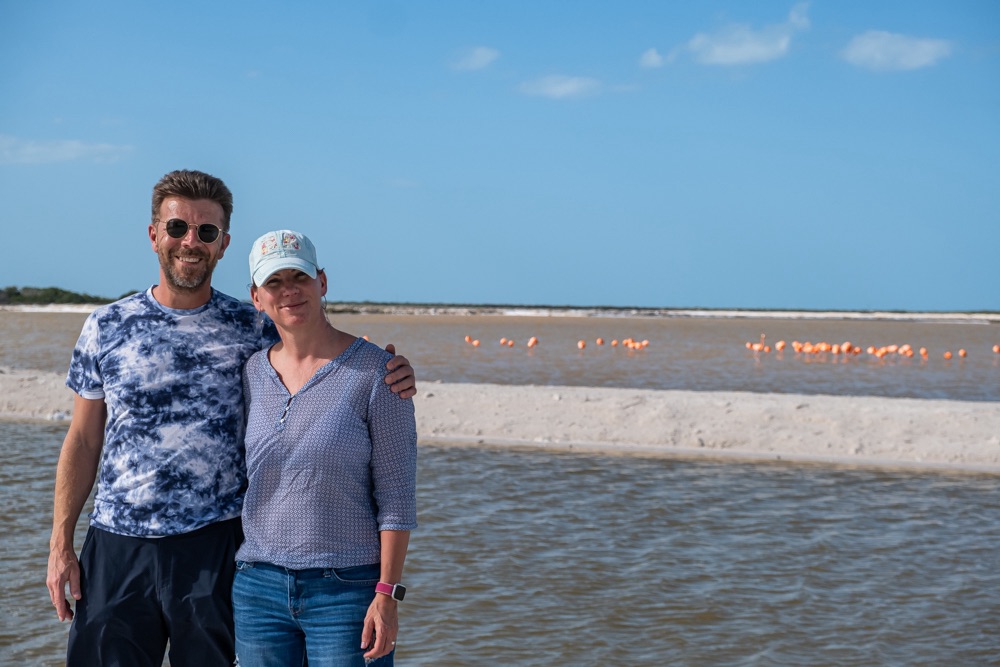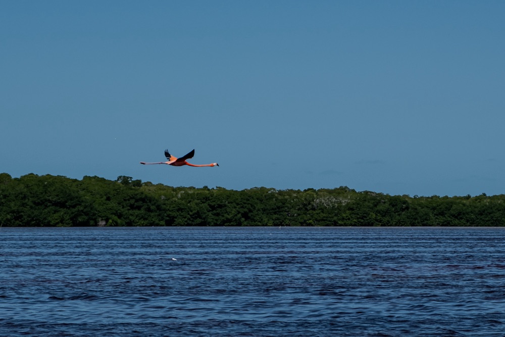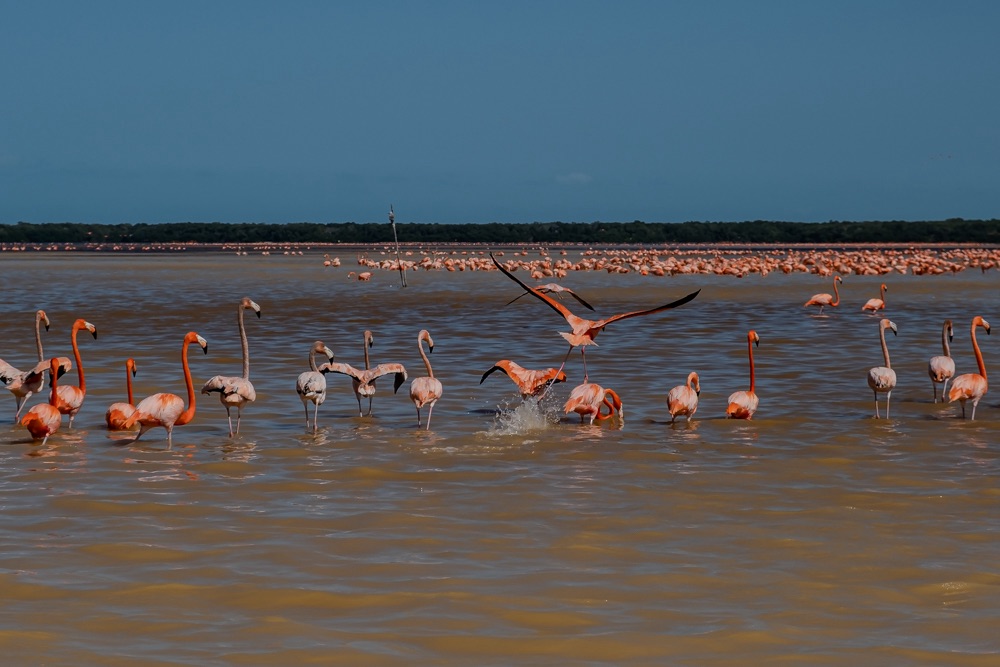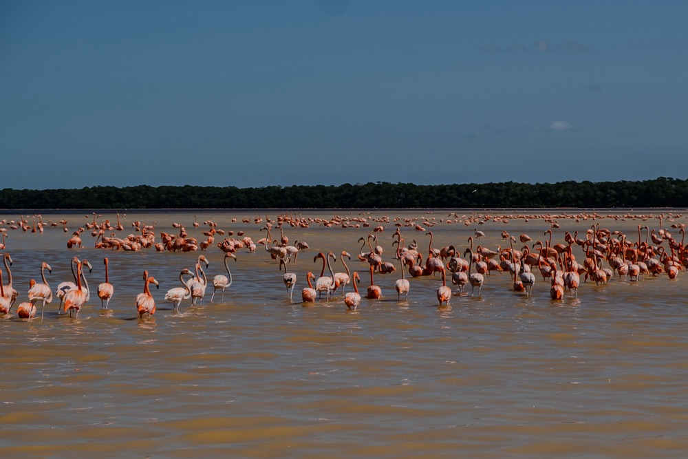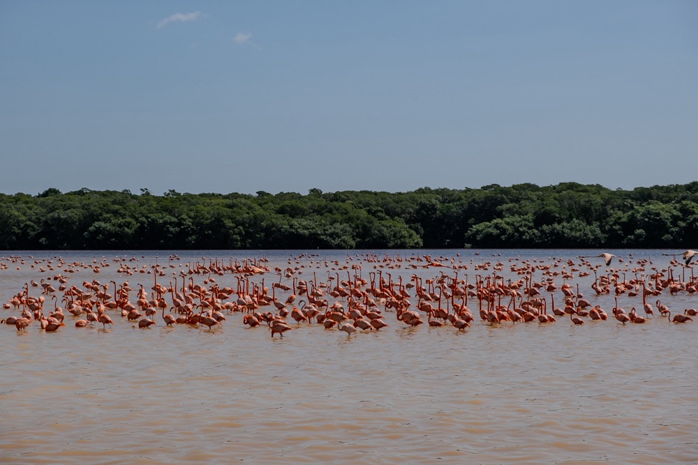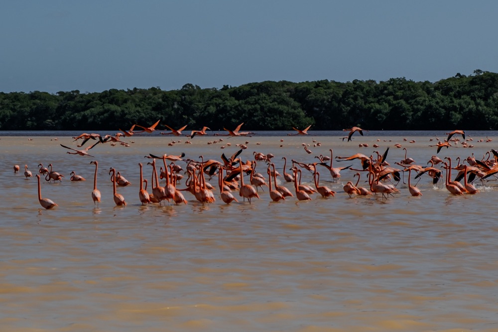 Első állomás a közel 20 ezer flamingóból álló terület megtekintése volt. A leállított motorcsónakkal csak álltunk a nyugvó szinte piros vízen és csodáltuk a közelünkben napozó, időnként fel-felszálló flamingókat. A baba flamingók még szinte fehérek, aztán minél idősebb annál sötétebb lesz a színe. A víz karotinkoncentrációja miatt a Celestún flamingói a legrózsaszínesebbek a világon. Ezen a területen december és március között van sok flamingó, az év ezen hónapjaiban érdemes idelátogatni.