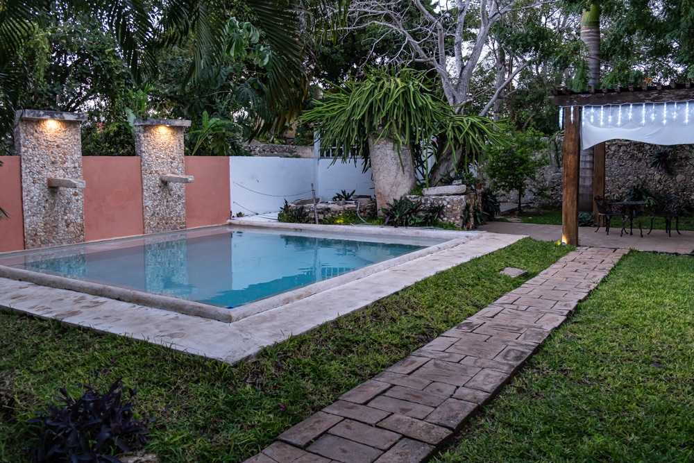 Mára egy romot és cenote túrát terveztünk. A rom fix: Mayapán, a cenote nyitott volt. Mindketten keresgéltünk cenotékat a térképen, egy volt, amit mindketten kiírtunk, így egyértelmű volt, hogy azzal kezdünk. Az odafelé vezető úton kiolvastam, hogy ez nem egy hagyományos hely, hanem vezetett túra van egy kis történelemmel vegyítve és érdemes előre foglalni. Na, de ha már úton vagyunk, gondoltuk oda nézünk. Az előző csoport épp bement, majd egy órát kellett volna várnunk. Ezért inkább a helyi srác által javasolt falu széli, szomszéd néni kertvégi cenotéjéba ugrottunk be és közben kitaláltuk, hogy holnap reggelre fogunk az előző túrára beregisztrálni. A szomszéd néni cenotéja mélykék színű volt, nem volt annyira hideg mint az előzőek és klasszul le lehetett látni a vízben. Váltásban jöttünk / mentünk: vagyis mikor érkeztünk ment el egy pár, mikor meg mi mentünk épp jött két fiatal helyieknek tűnő pár.