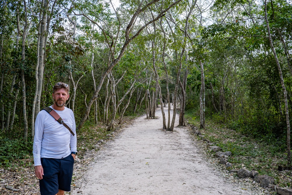 Az idefelé vezető úton, ajánlottak nekünk még egy cenotét, ami ugyan családi kézben van, de tök szépen kiépítve, karban tartva. Ehhez is egy 20 percet kellett autózni, de megérte. Ekkor már 34 fok volt, minden porcikánkkal egy kis hűsölésre vágytunk. A Cenote Sac-Aua egy kis falu egyik családi házának kertjében van. De ez nem egy kicsi kert, a kocsitól 5 percet gyalogoltunk. Mindenhol kötelező előtte zuhanyozni, amennyire tudnak vigyáznak a víz tisztaságára. Ez a cenote nem volt olyan mély, viszont a közepén volt egy sziget. Kis kajakok bekészítve és úszva, vagy kajakozva élvezhetted a hűvös levegőt, vagy a hideg vizet. Tök magunkban voltunk itt. A végén jött egy francia pár, de akkorák a cenoték, hogy azért az még nem zavaró.