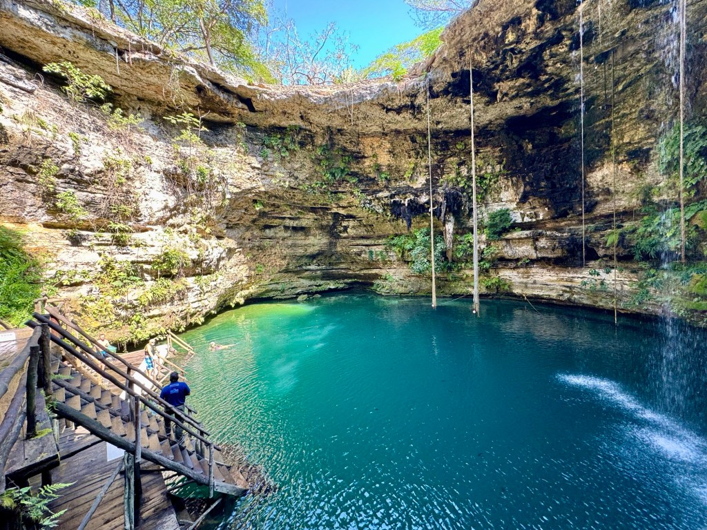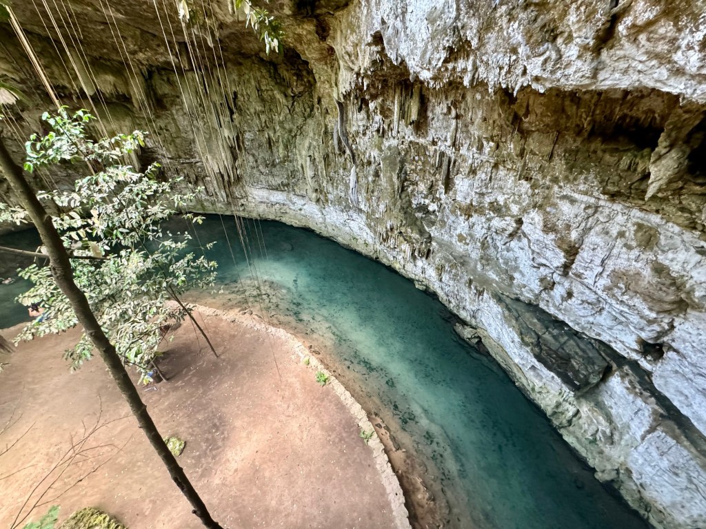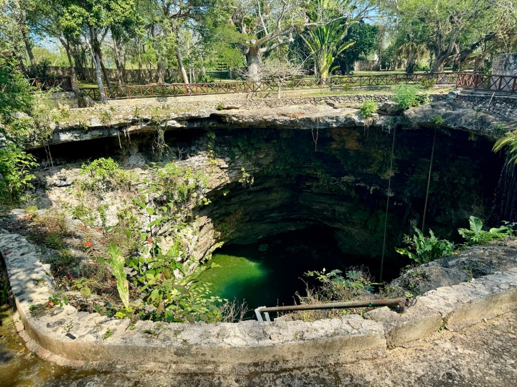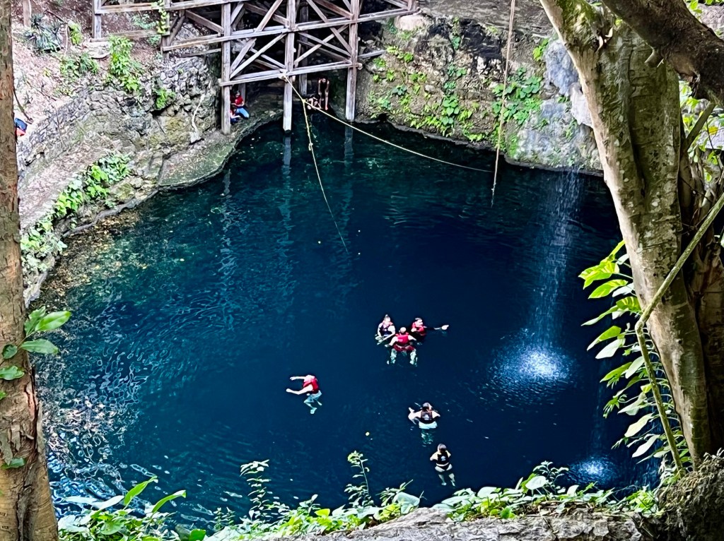 Az első hely egy aránylag nagy cenote volt az eddig látottakhoz képest, megmutatták aztán hagytak minket fürdőzni. Itt volt mosdó is, ahol át is lehet öltözni. A levezető lépcsőn és a cenote kiépítettségén látszott, hogy ezt egészen régóta használják. Érdekes volt belegondolni, hogy valószínűleg a tikkasztó melegben az ültetvényen dolgozó megfáradt emberek is itt frissítették fel magukat az 1800-as évek második felében.