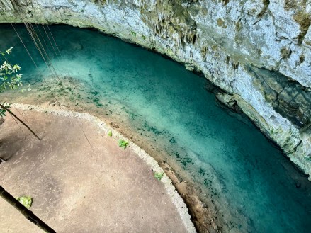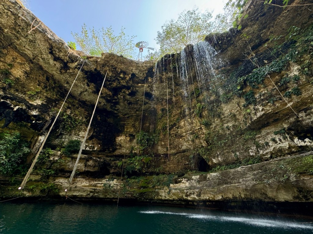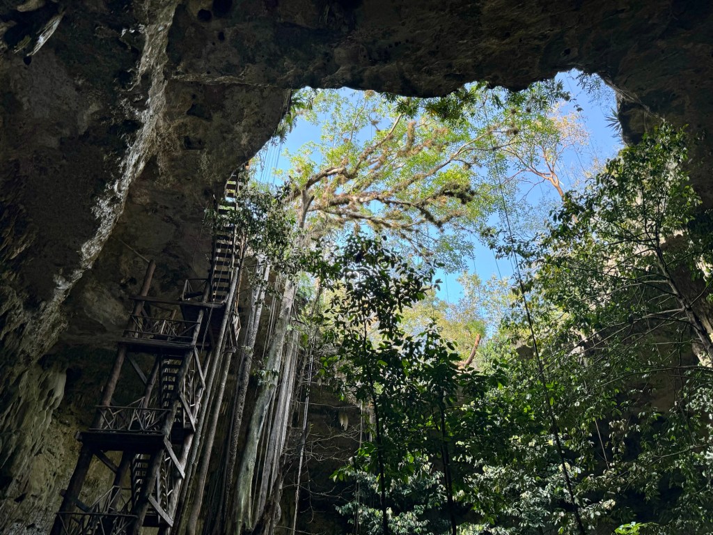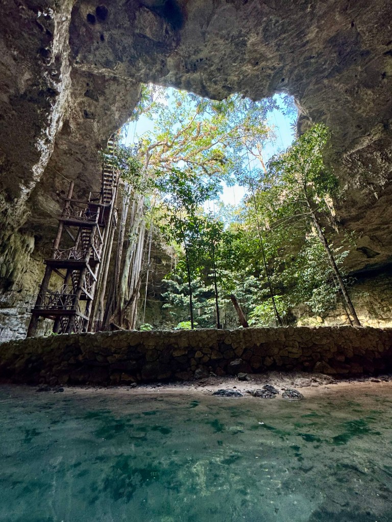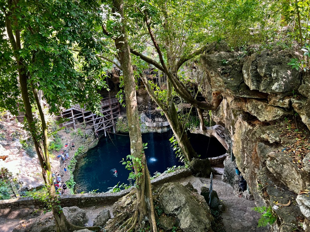 Az első hely egy aránylag nagy cenote volt az eddig látottakhoz képest, megmutatták aztán hagytak minket fürdőzni. Itt volt mosdó is, ahol át is lehet öltözni. A levezető lépcsőn és a cenote kiépítettségén látszott, hogy ezt egészen régóta használják. Érdekes volt belegondolni, hogy valószínűleg a tikkasztó melegben az ültetvényen dolgozó megfáradt emberek is itt frissítették fel magukat az 1800-as évek második felében.