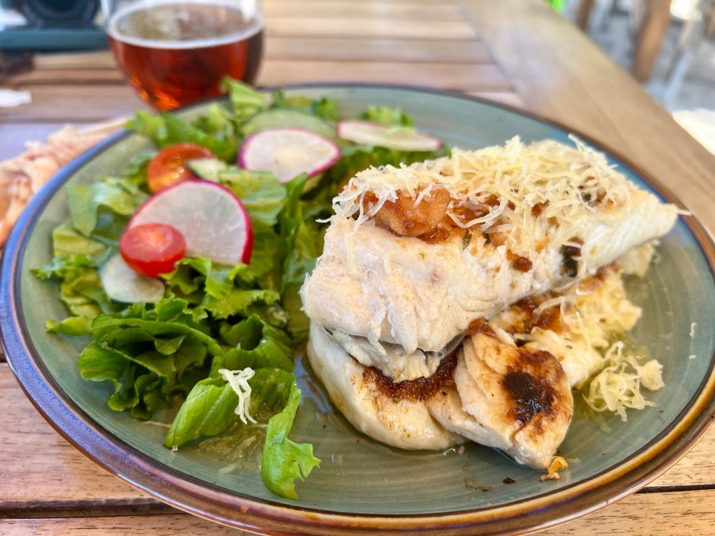 Nagyjából félúton megebédeltünk. A kinézett étterem mégse délben nyitott, hanem 3 órakor, viszont még csak fél 2 volt. Körbenéztünk, hogy milyen egyéb kaja lehetőség van. Az út túloldalán volt egy jó kis tacos büfé. Egy liter hűtött limonádé és a két jól megpakolt taco 2400 forint volt szép műanyag pohárral és tányérral.