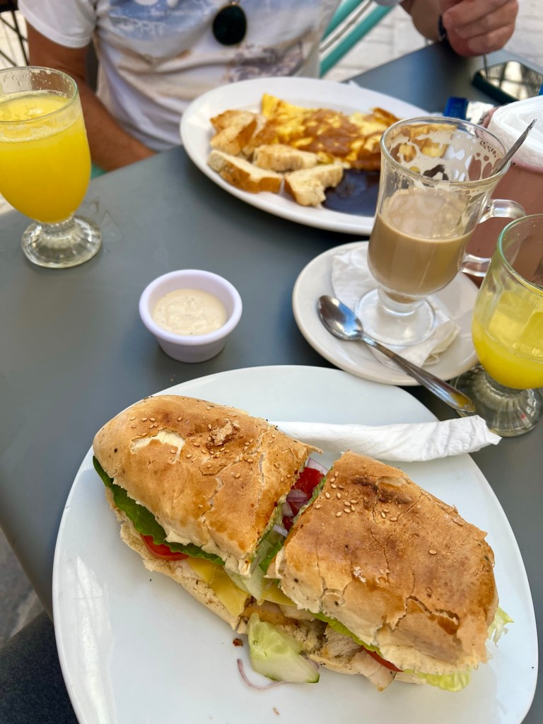 Szeretjük nézegetni a térképet, azon felfedezni az éttermeket, kávézókat, reggelizőket, kiolvasni az értékeléseket, végig lapozni a mások által feltöltött kaja képeket. Így találtuk meg a Rossz Anya (Mala Madre) nevű reggelizős helyet 1 percre a házunktól. Reggel 9-kor már ott gyakoroltam a spanyol nyelvet. Míg vártuk a reggelinket eleredt az eső, de nem tartott sokáig, pár perc múlva már csak be volt borulva és mire elindultunk sütött a nap.