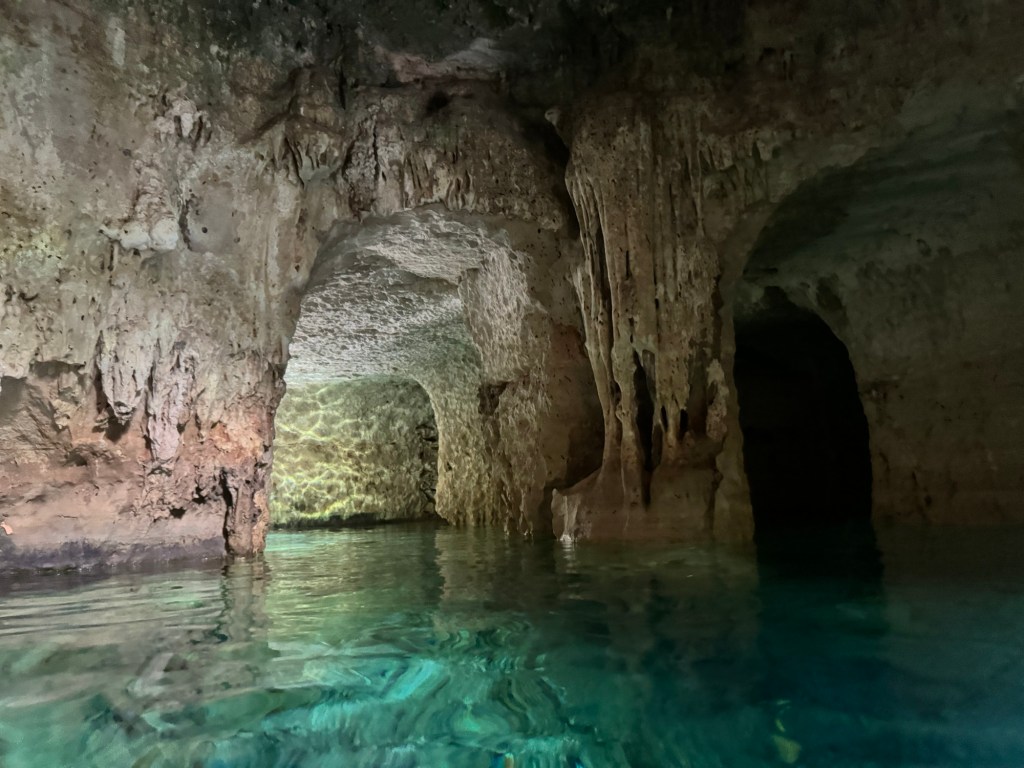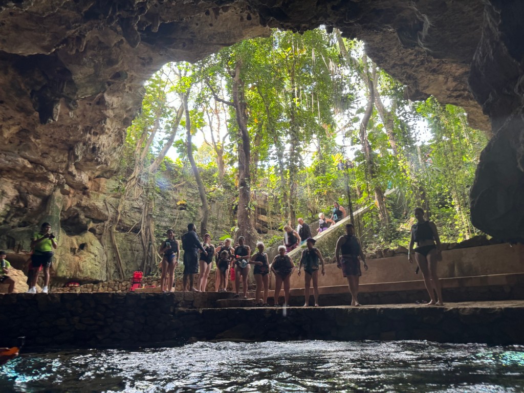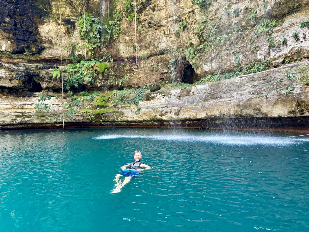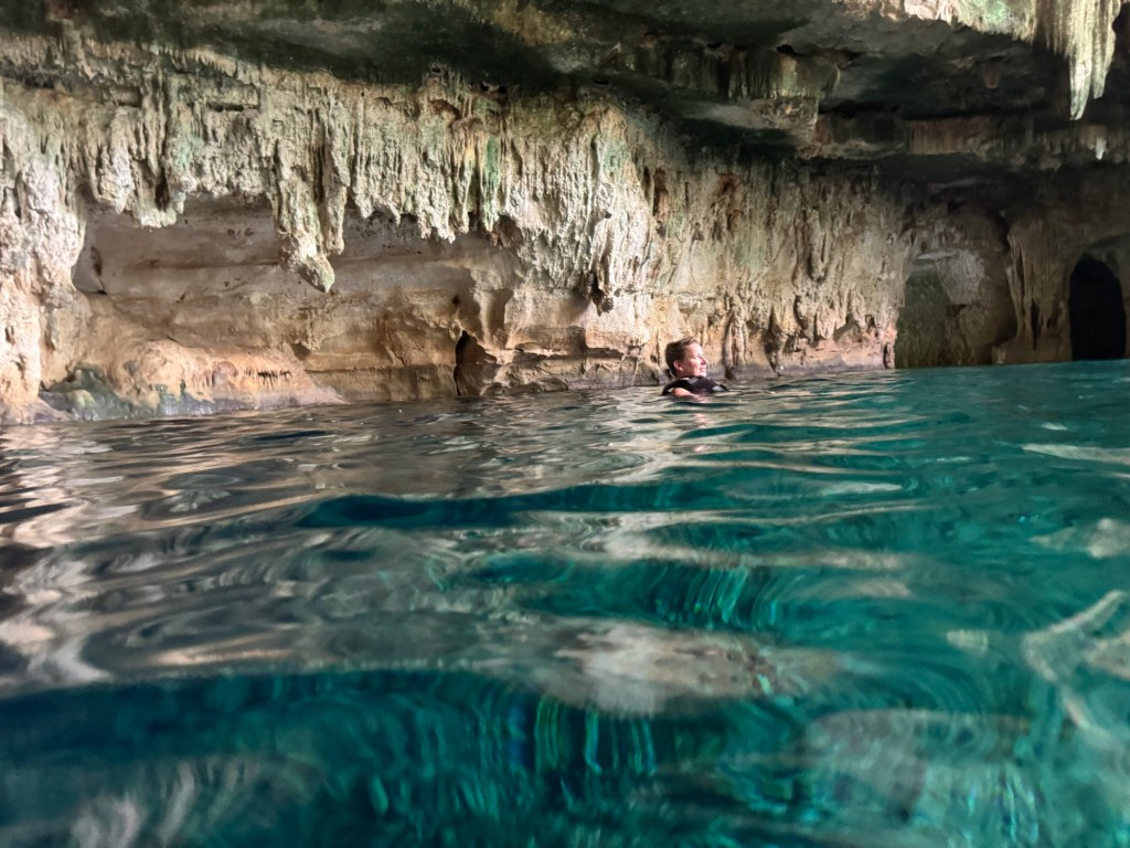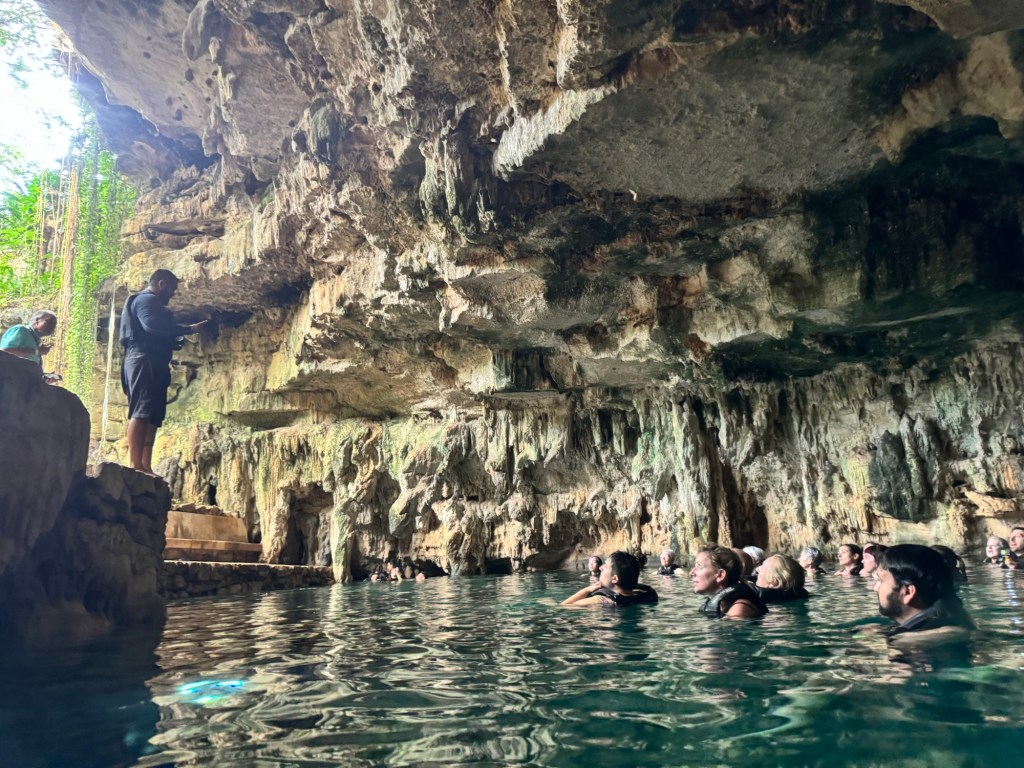 A kétórás túra második felében lementünk az első cenoteba, amely egy félig nyitott, 7 méter mély gyönyörű kék, nagyon tiszta vizű vízgyűjtő volt. Ebből a cenotéból egy nyitott csatornán keresztül úsztunk át a második cenotéhoz. A csatornából kiérve egy barlangba sétáltunk be (pár lépést), ami a második cenote volt. Egy teljesen más világ fogadott minket: a melegebb vizű szinte teljesen zárt barlangban mindenhonnan cseppkövek lógtak le, néhol a vízbe bele. Ezzel, hogy vezetett túrán voltunk teljesen más élményben volt részünk. Persze maga a Hacienda története is sokat adott hozzá.