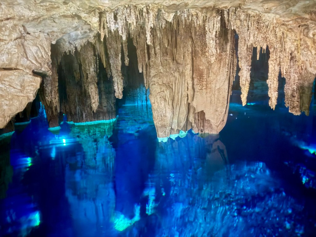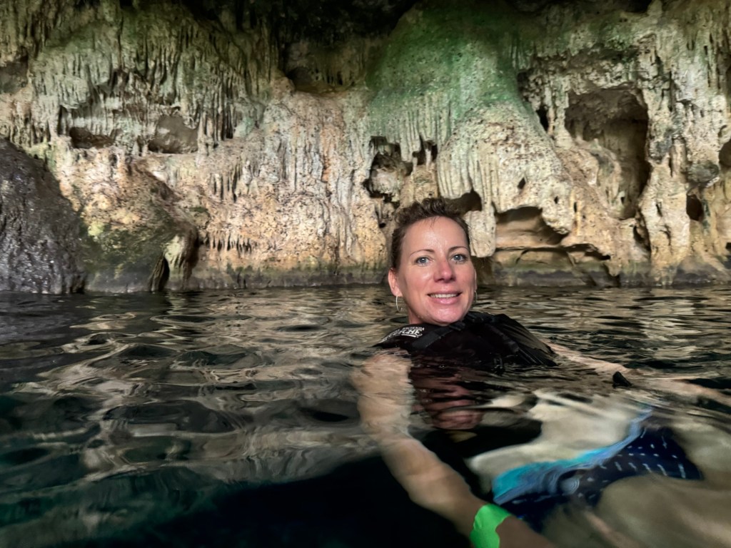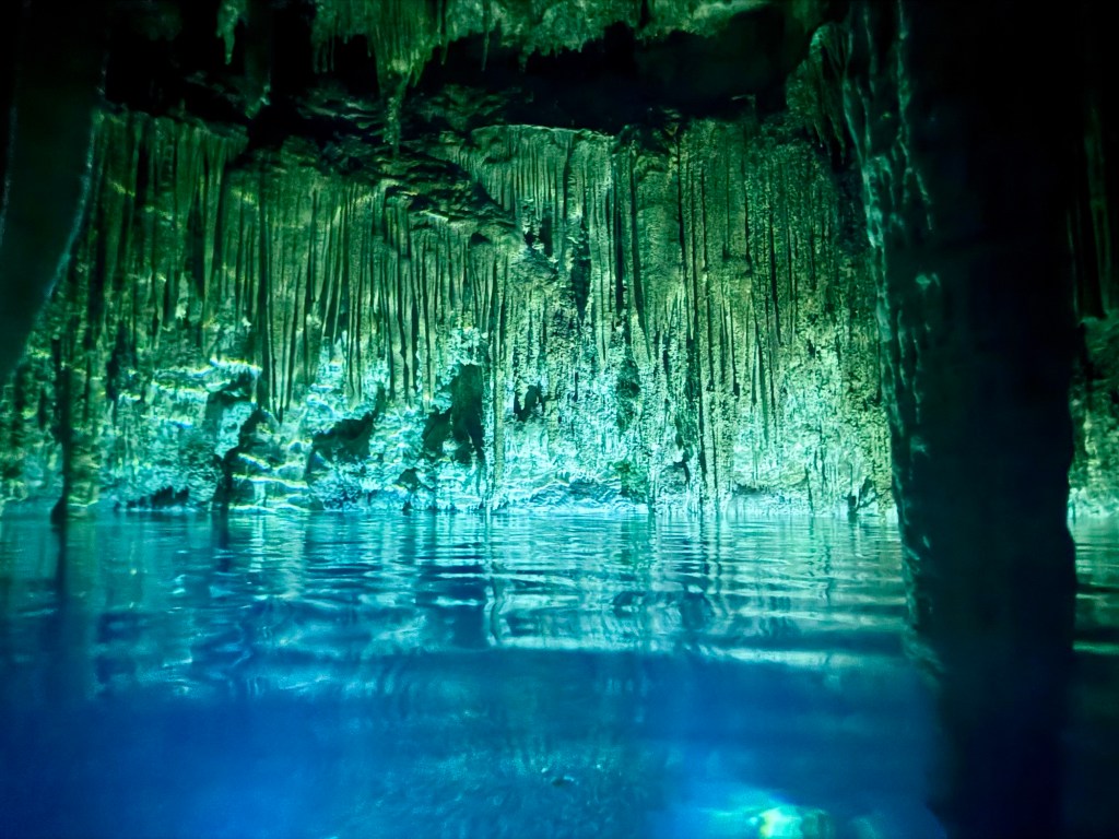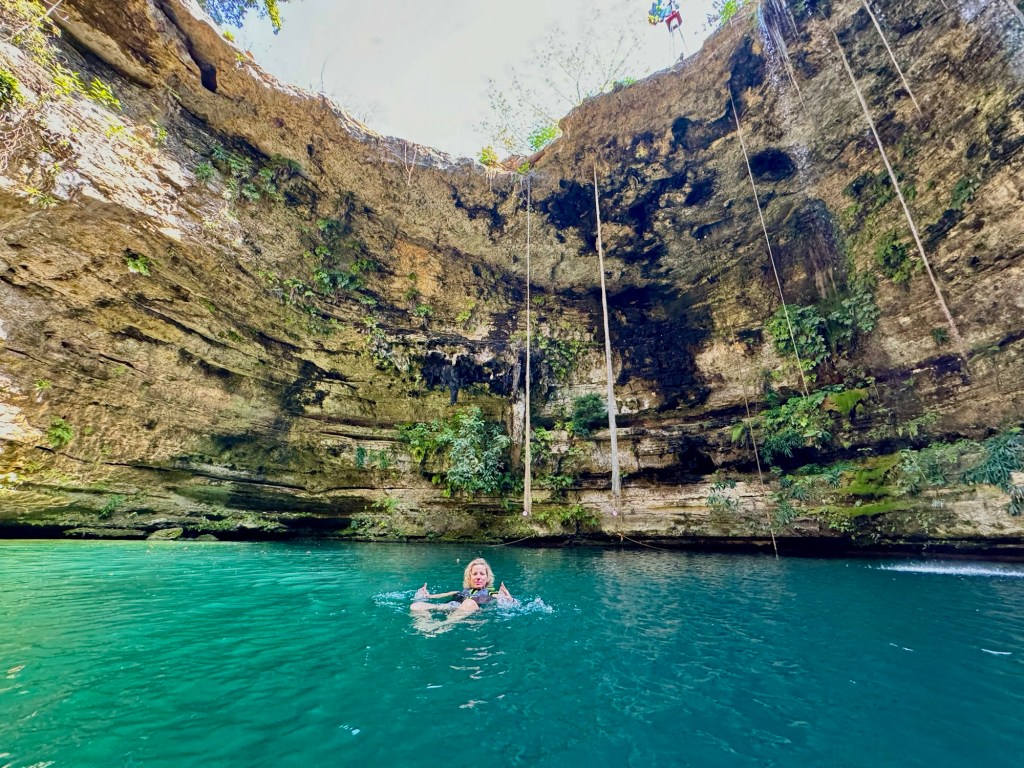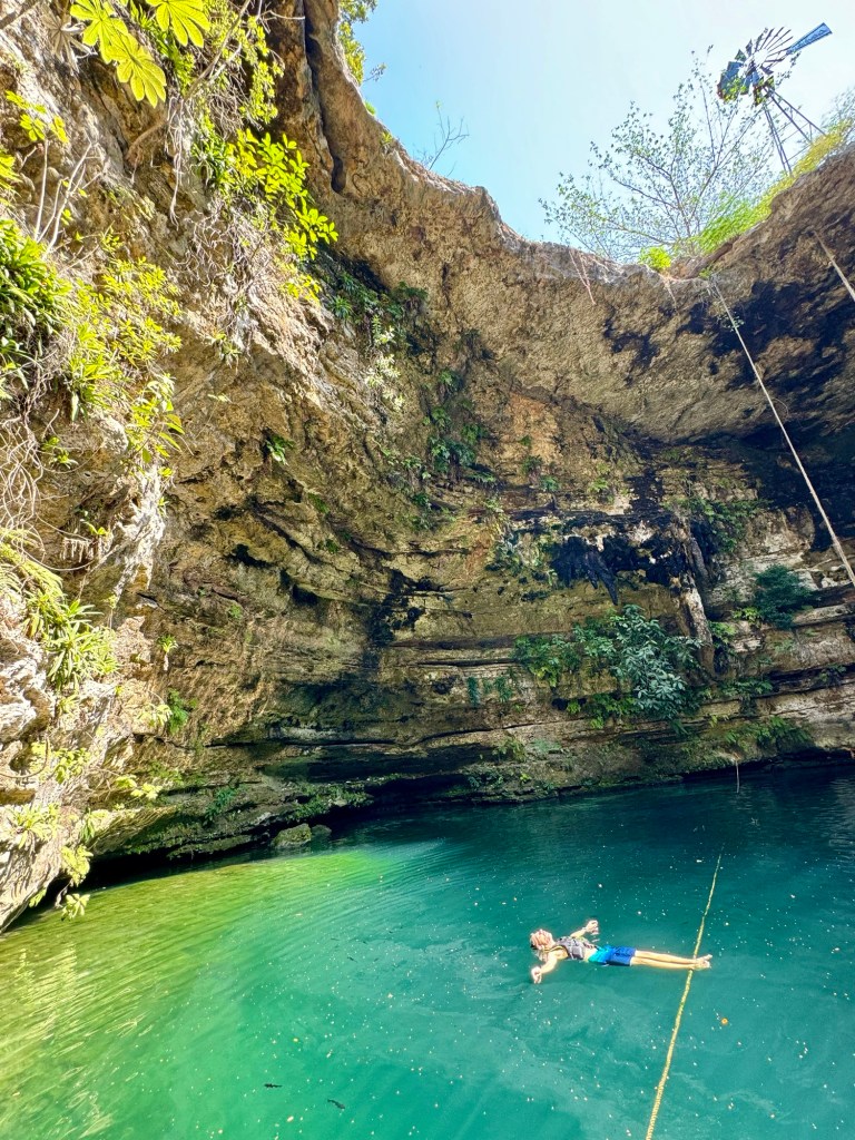 A kétórás túra második felében lementünk az első cenoteba, amely egy félig nyitott, 7 méter mély gyönyörű kék, nagyon tiszta vizű vízgyűjtő volt. Ebből a cenotéból egy nyitott csatornán keresztül úsztunk át a második cenotéhoz. A csatornából kiérve egy barlangba sétáltunk be (pár lépést), ami a második cenote volt. Egy teljesen más világ fogadott minket: a melegebb vizű szinte teljesen zárt barlangban mindenhonnan cseppkövek lógtak le, néhol a vízbe bele. Ezzel, hogy vezetett túrán voltunk teljesen más élményben volt részünk. Persze maga a Hacienda története is sokat adott hozzá.