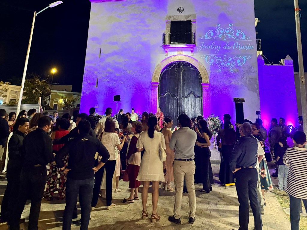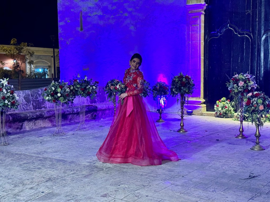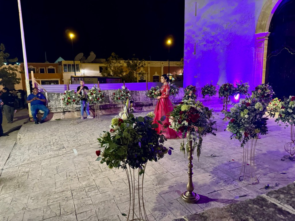 Este nyugiban, időnkét bebóbiskolva nézegettük a képeket a szobában, meg írtam a blogot, amikor egyszer csak tök közelről fellőtt tűzijáték hangja vert életet újra belénk. Először nem is tudtuk, hogy ez mi, csak a hangra mentünk ki, és a felettünk jópár perces csinnadratta kivitt minket az utcára. A szálló egy kis téren van, a tér túloldalán szép katolikus templom előtte pedig mintha egy 40-50 fős esküvő lenne. De a lány m, akit ünnepeltek nem mennyasszonyi ruhában volt, hanem pirosban sok-sok díszítéssel. Vőlegény meg sehol. A lány neve fényfestéssel a templom falára kiírva, 12 fős zenekar, 8-10 felszolgáló pezsgős tárcával a kezükben kínálva a vendég sereget, hangosítás, torta, kaja, fotós, videós és minden. Nem igazán értettük, de az egyik felszolgáló fiút megkérdeztem és a lány 15-dik születésnapját ünnepelték. Egy régi maja hagyomány alapján mindmáig fontos ünnep a 15. születésnap Dél-Amerika országaiban, amikor a gyermek felnőtté válását ünneplik. Elsősorban a lányok esetében csinálnak ekkora partit.