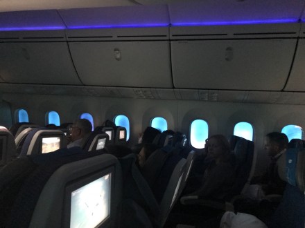 Boeing 787-es géppel repülünk. Dió Csabi mondta is, hogy ez már egy modernebb gép lesz. És tényleg: nagyobbak az ablakok, amiket nem kézzel lehúzható kis redőnnyel láttak el, hanem az ablak alatt lévő gomb nyomkodására besötétedik az ablak.